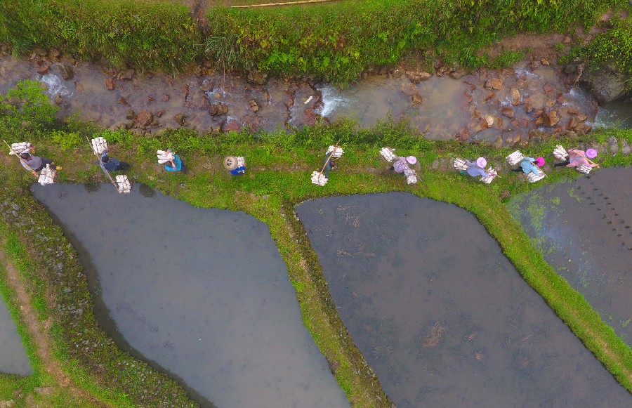 In this aerial photo taken on April 27, 2019, poverty alleviation officials join villagers on their way to an edible fungi plant in Gaoxian Village of Rongshui Miao Autonomous County, Liuzhou, south China's Guangxi Zhuang Autonomous Region. (Xinhua/Huang Xiaobang)