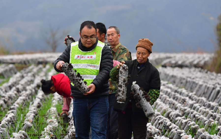 Yang Jue (front), a poverty alleviation official who has been assigned as the Party chief to Shangli Village, visits an edible fungi plant in Rongshui Miao Autonomous County of Liuzhou, south China's Guangxi Zhuang Autonomous Region, Feb. 28, 2019. (Xinhua/Huang Xiaobang)
