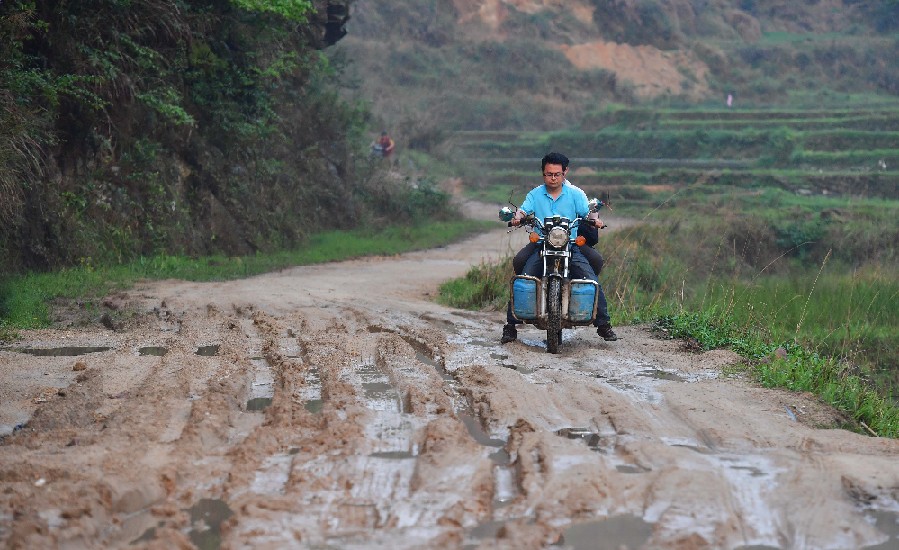 Huang Zhenshuang, a poverty alleviation official who has been assigned to Gandong Village, rides a motorbike during work in Rongshui Miao Autonomous County of Liuzhou, south China's Guangxi Zhuang Autonomous Region, April 27, 2019. (Xinhua/Huang Xiaobang)