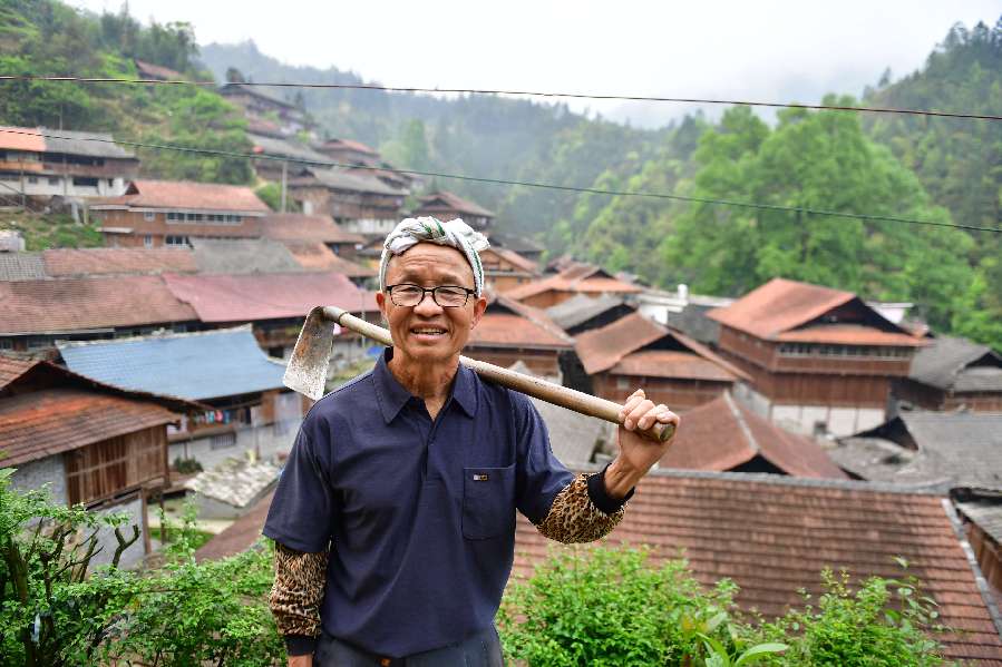 Villager and Party member Liang Anhe is pictured on the way to plant ornamental trees in Wuying Village of Rongshui Miao Autonomous County, Liuzhou, south China's Guangxi Zhuang Autonomous Region, April 17, 2019. (Xinhua/Huang Xiaobang)