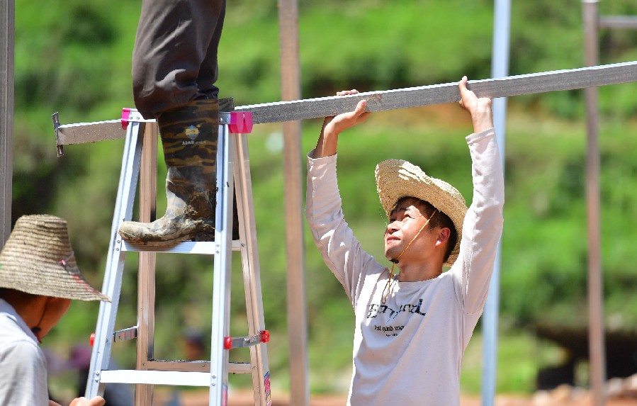 Huang Dingye, a poverty alleviation official who has been assigned to Dangjiu Village, works with villagers to build a greenhouse in Rongshui Miao Autonomous County of Liuzhou, south China's Guangxi Zhuang Autonomous Region, June 2, 2019. (Xinhua/Huang Xiaobang)
