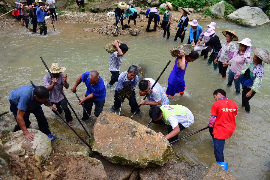 Wei Guihua (2nd R, front), a poverty alleviation offcial who has been assigned as the Party chief to Wuying Village, joins villagers to build a river dam in Rongshui Miao Autonomous County of Liuzhou, south China's Guangxi Zhuang Autonomous Region, July 3, 2019. (Xinhua/Huang Xiaobang)