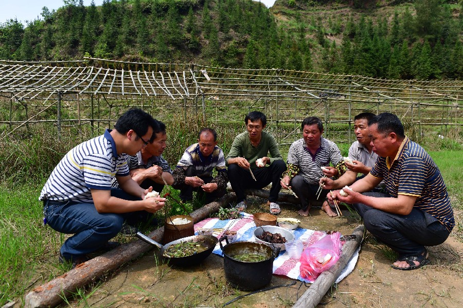 Huang Zhenshuang (1st L), a poverty alleviation official who has been assigned to Gandong Village, has a lunch with villagers during field work in Rongshui Miao Autonomous County of Liuzhou, south China's Guangxi Zhuang Autonomous Region, April 20, 2019. (Xinhua/Huang Xiaobang)
