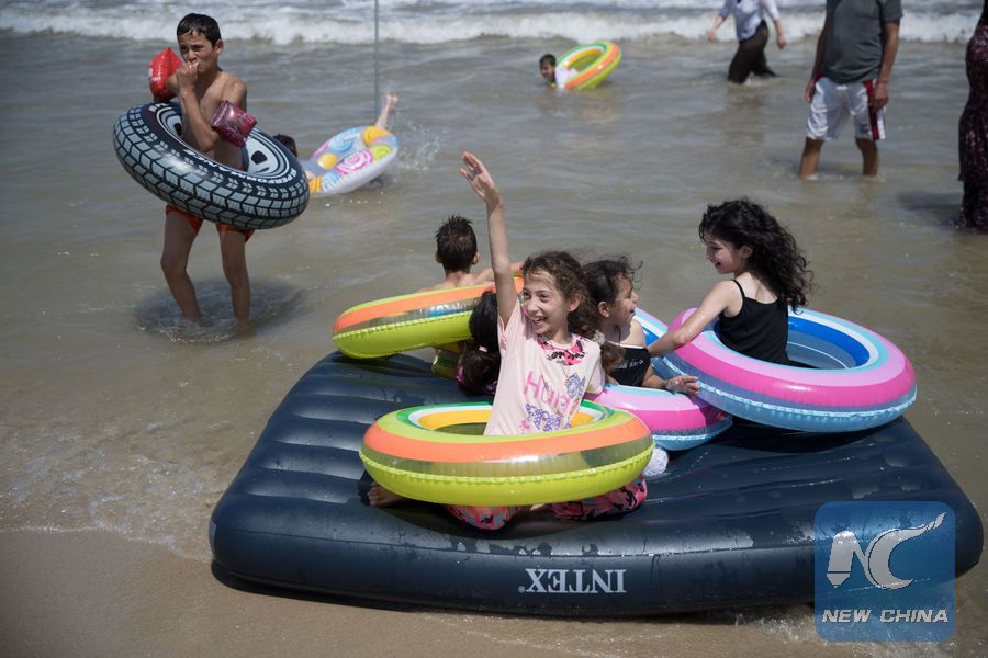 Palestinian children play on the beach of Tel Aviv, Israel, on July 8, 2019. (Xinhua photo by Guo Yu)