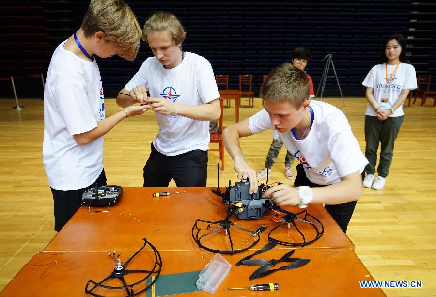 Contestants from Russia assemble an unmanned aerial vehicle (UAV) during the first International Youth UAV Science Camp & Competition (IYUAVSCC) in Xi'an, northwest China's Shaanxi Province, July 21, 2019. The first IYUAVSCC, launched by Chinese Society of Aeronautics and Astronautics (CSAA) and Northwestern Polytechnical University, kicked off here on Monday, attracting high school students from home and abroad. (Xinhua/Shao Rui)