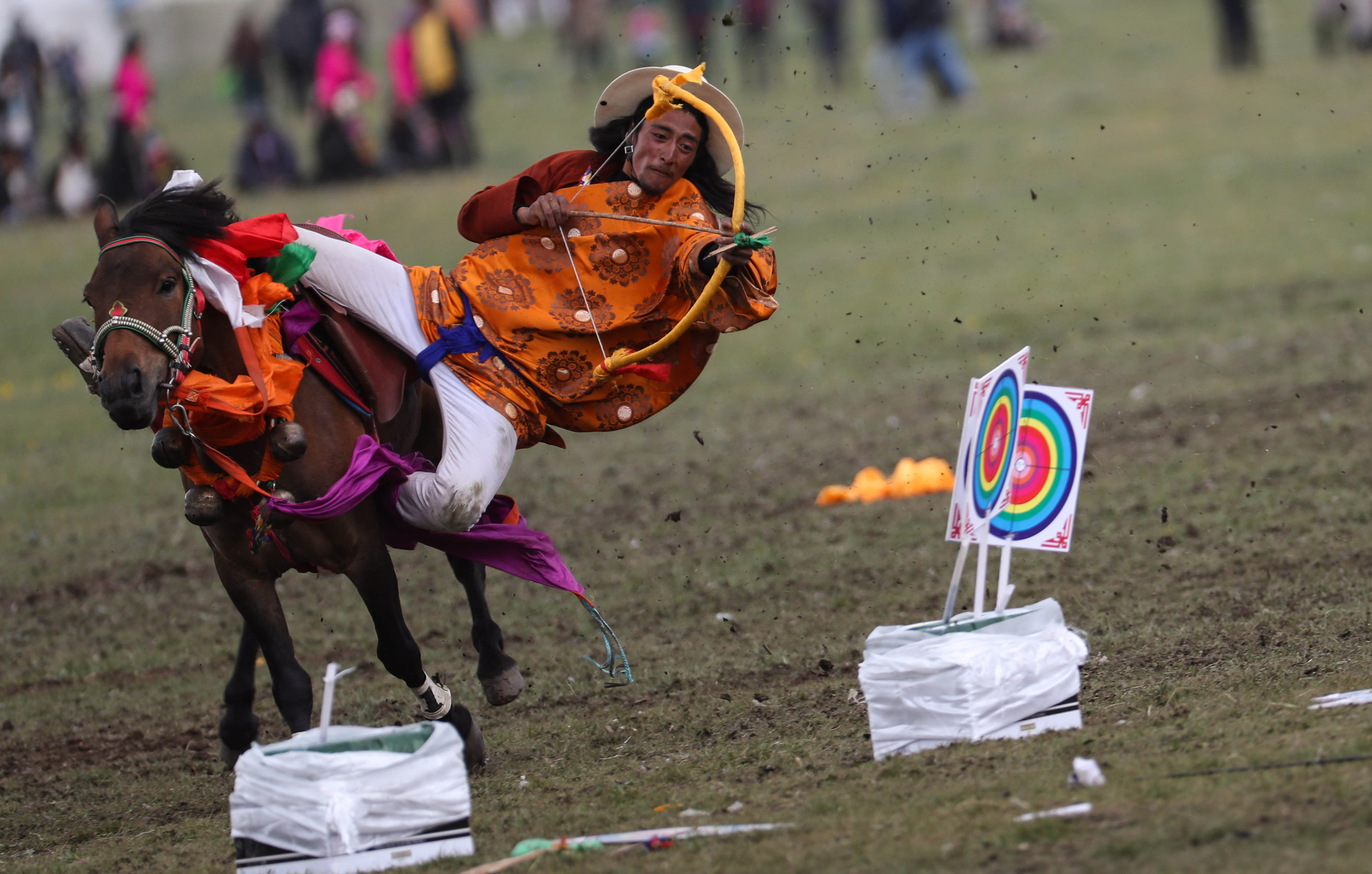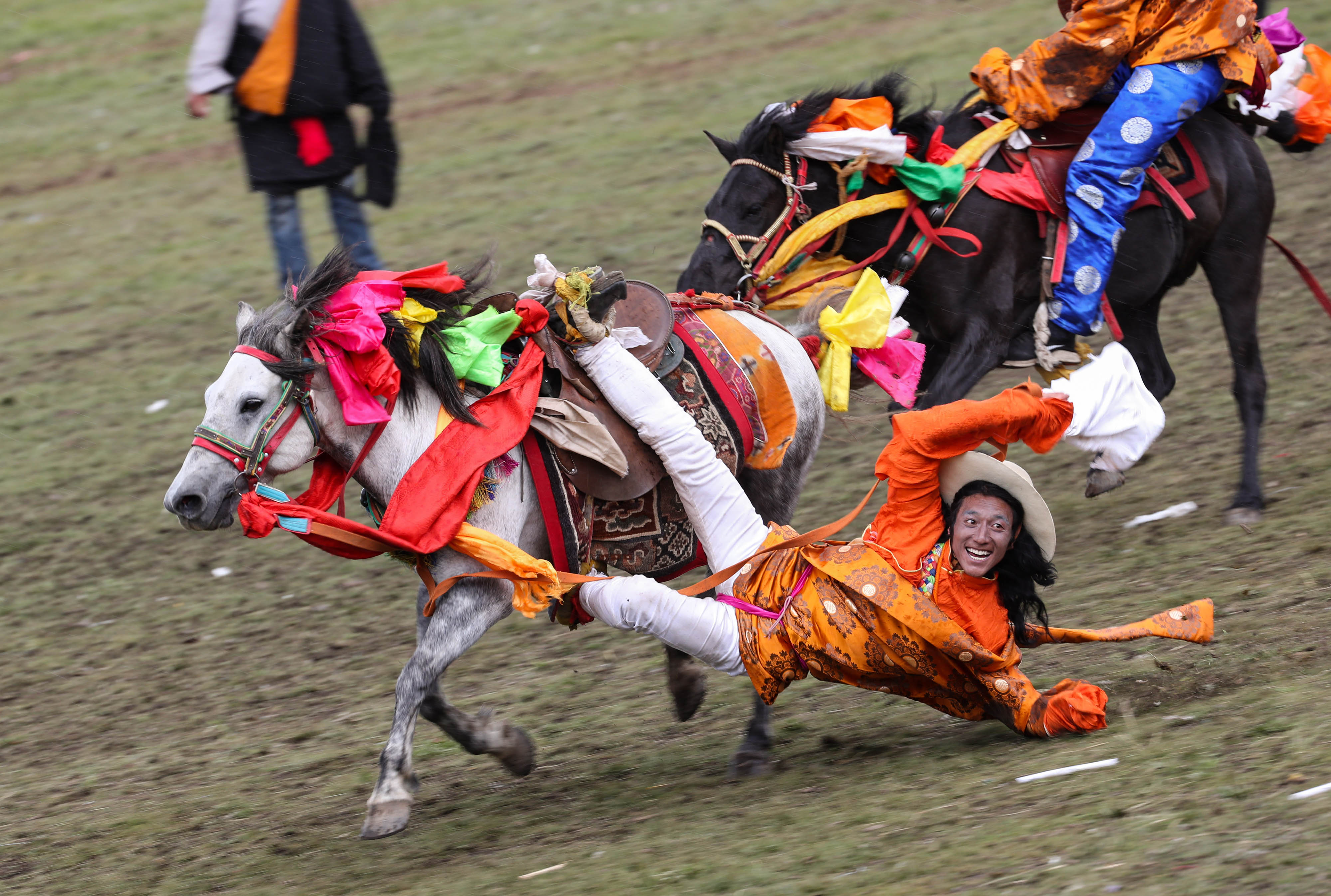 A rider performs horsemanship during a horse racing festival in Litang County, southwest China's Sichuan Province, July 30, 2019. (Xinhua/Jiang Hongjing)