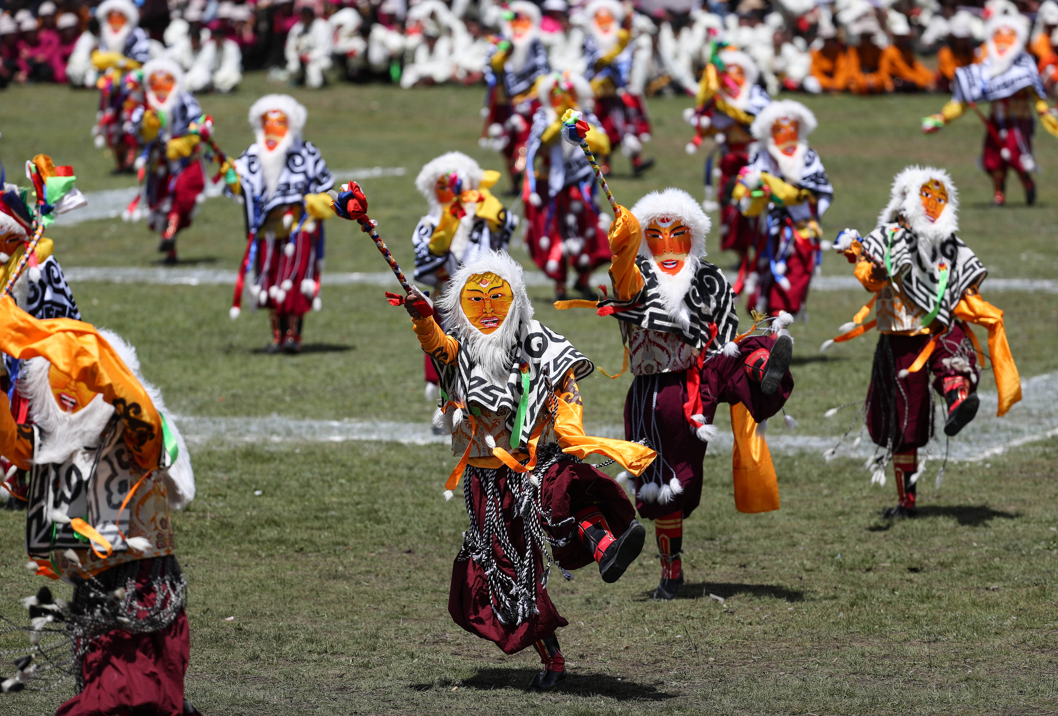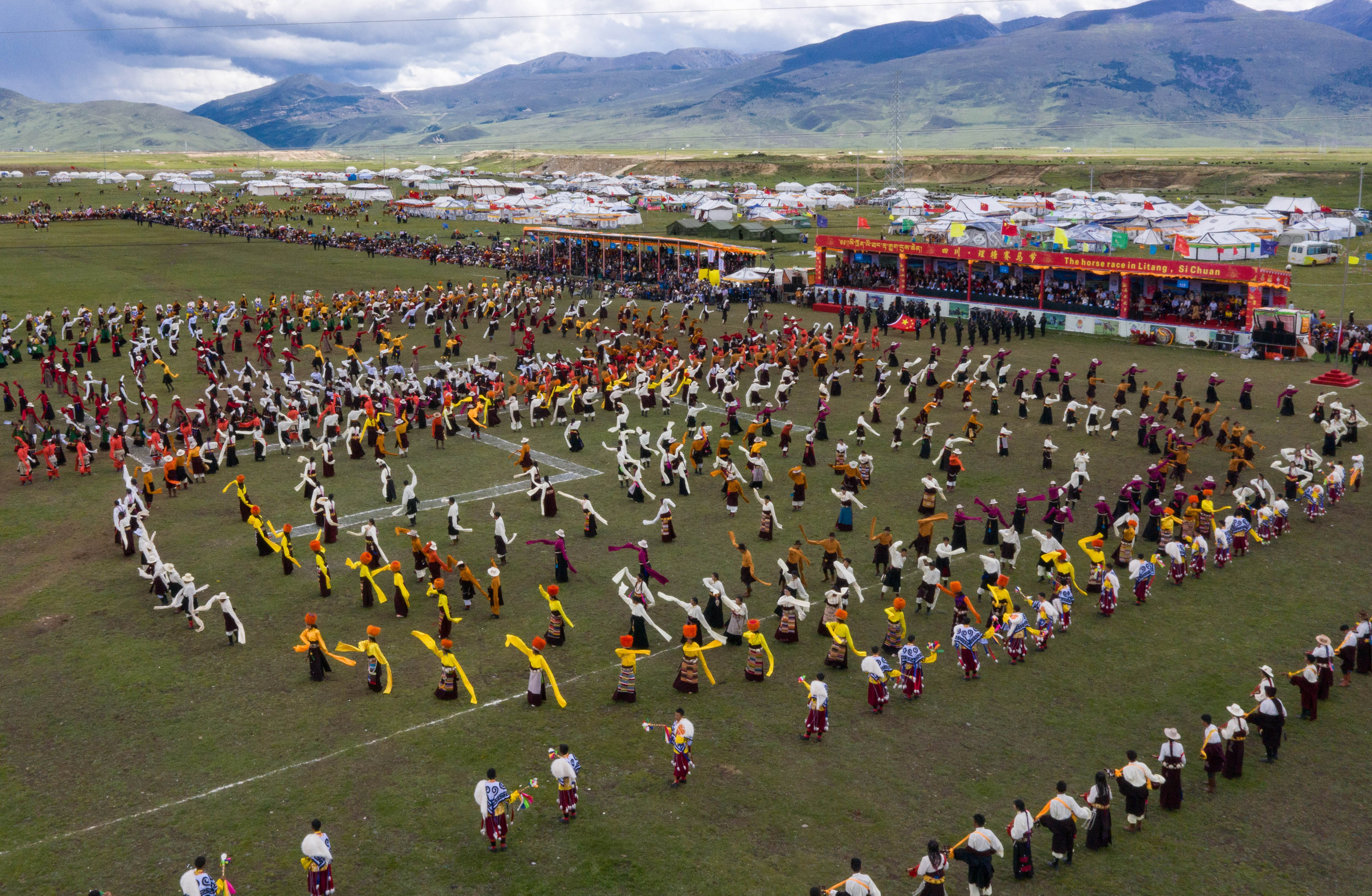 People perform Guozhuang dance, or Tibetan bonfire dance, on the opening ceremony of a horse racing festival in Litang County, southwest China's Sichuan Province, July 30, 2019. (Xinhua/Jiang Hongjing)