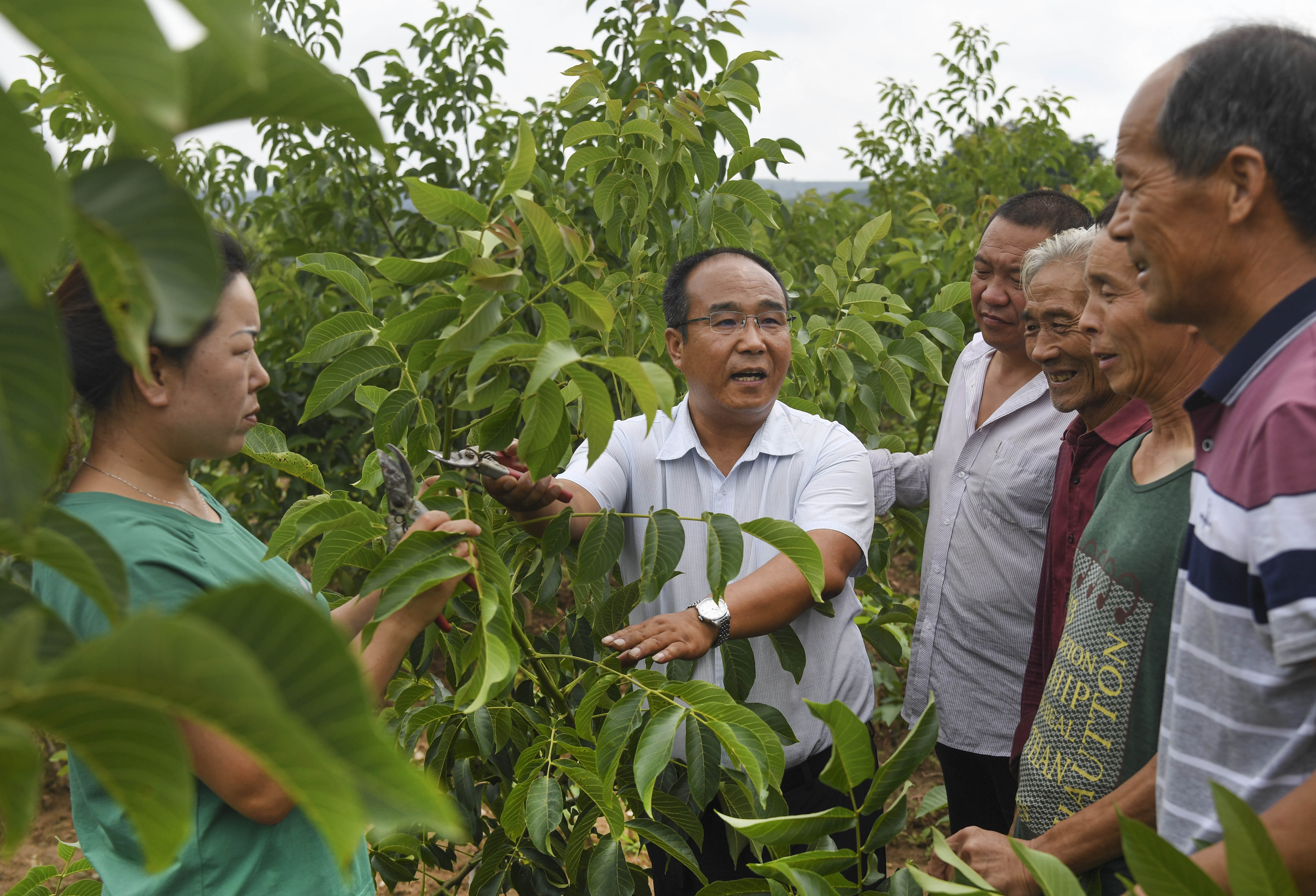 Dong Zhaobin (2nd L), general manager of local agricultural cooperative, explains the field management techniques for the walnut with red kernels in Luonan County, Shangluo, northwest China's Shaanxi Province, Aug. 5, 2019. (Xinhua/Tao Ming)
