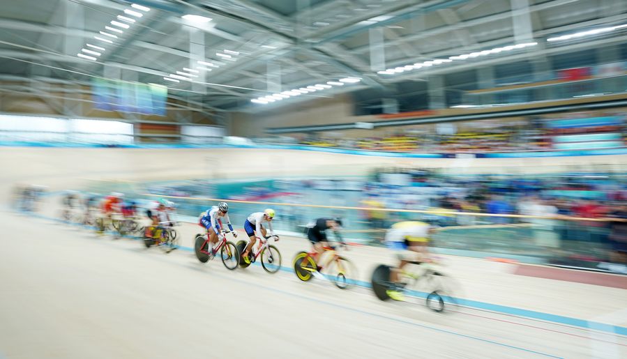 Cyclists compete during the cycling track men's omnium at the 2nd China Youth Games in north China's Shanxi Province, on August 9, 2019. (Xinhua/Ju Huanzong)