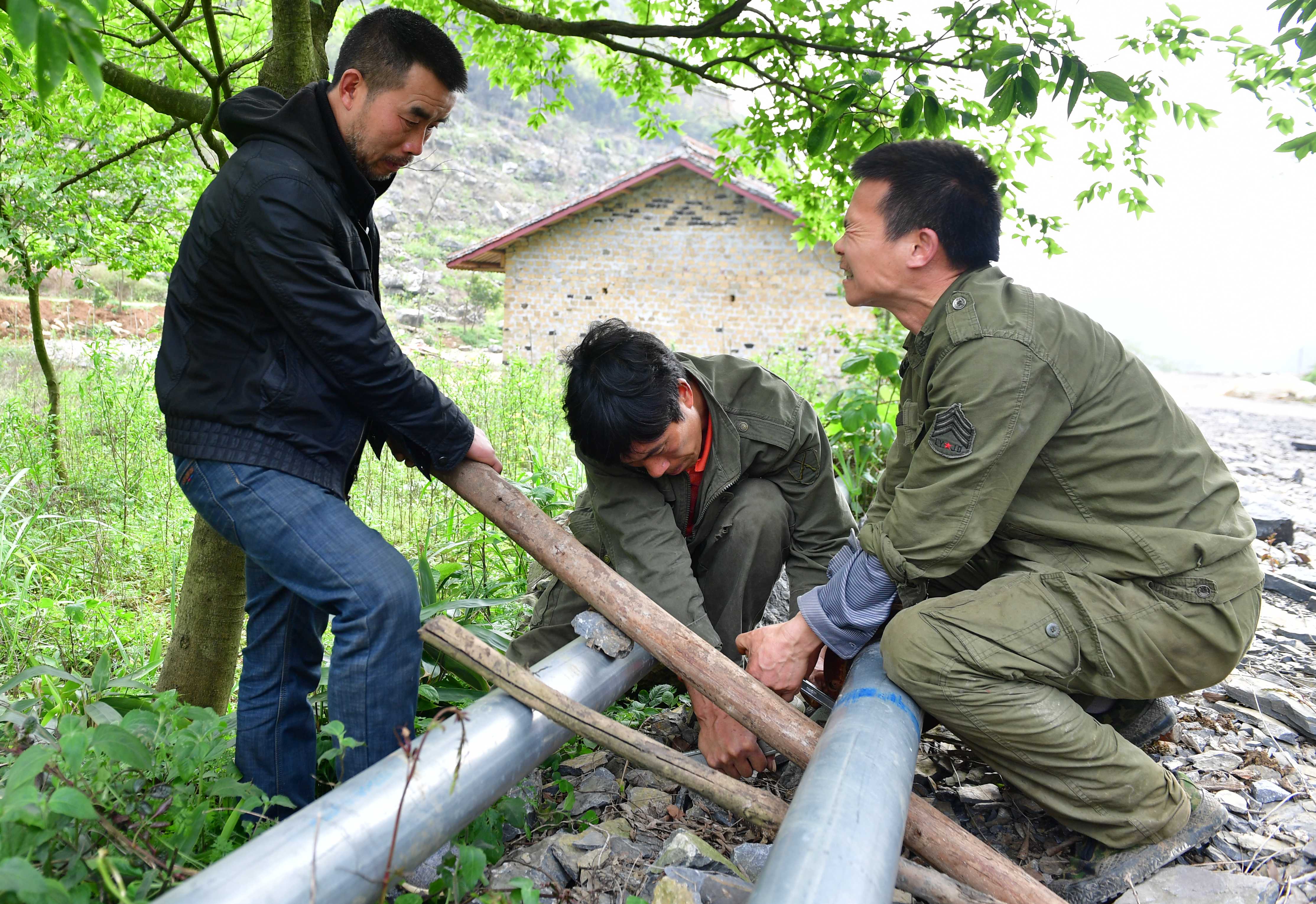 Long Gexiong (1st R) and his cousins lay down pipelines for water diversion at Tongbantun Village of Dongqi Township in Rongan County, south China's Guangxi Zhuang Autonomous Region. (Xinhua/Huang Xiaobang)