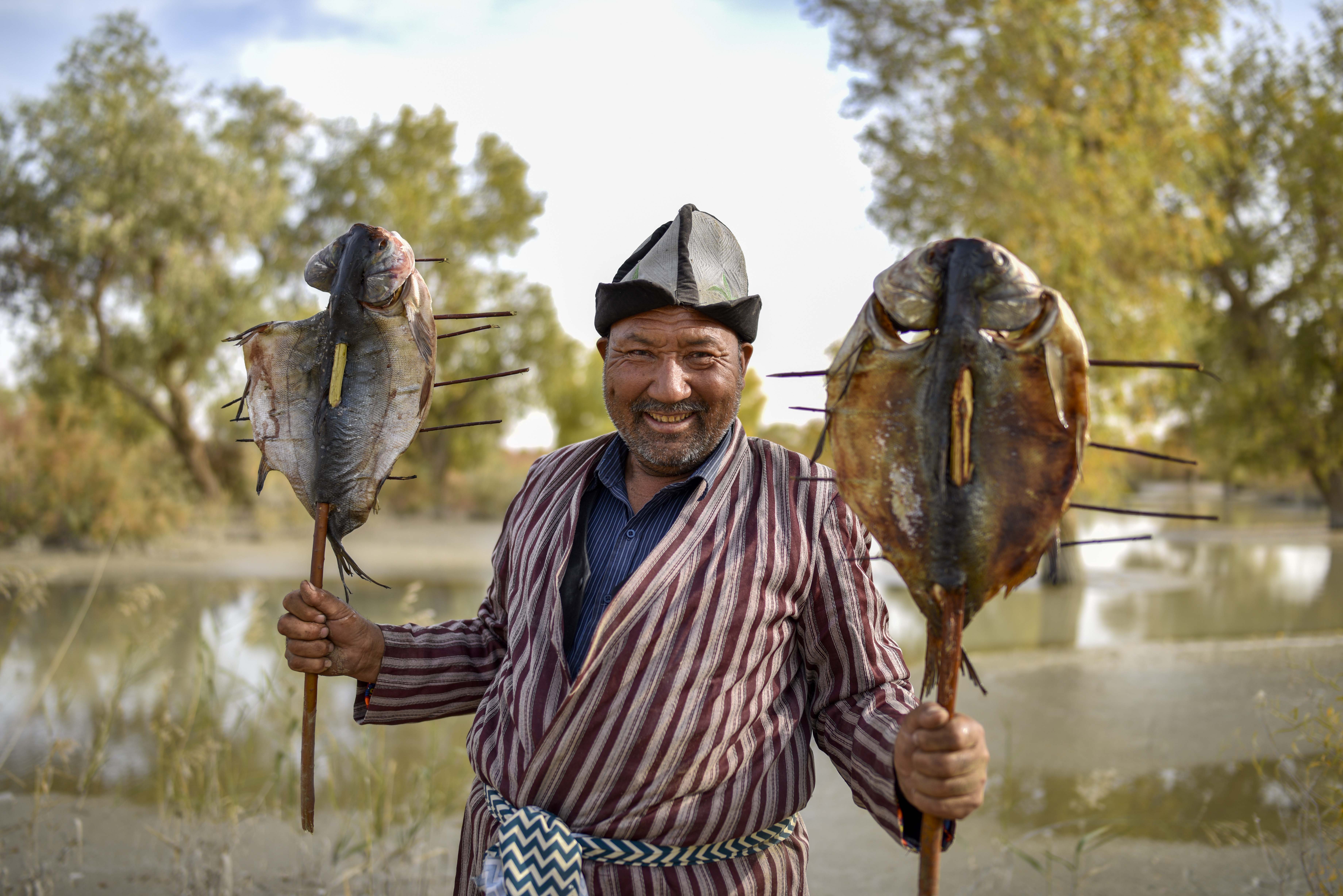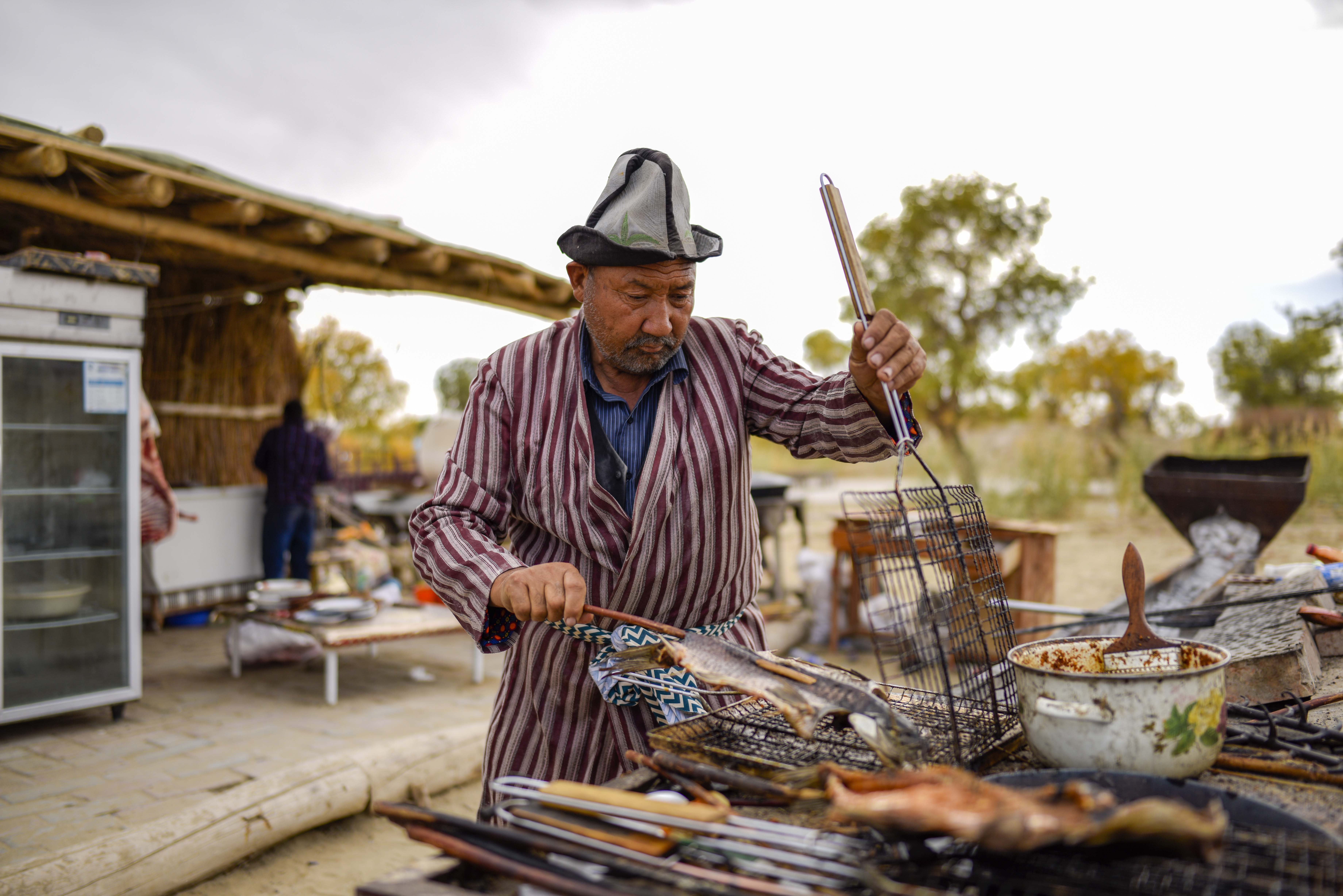 Amudun Abudu makes roasted fish in Lop Nur People Village in Yuli County, northwest China's Xinjiang Uygur Autonomous Region. (Xinhua/Zhao Ge)