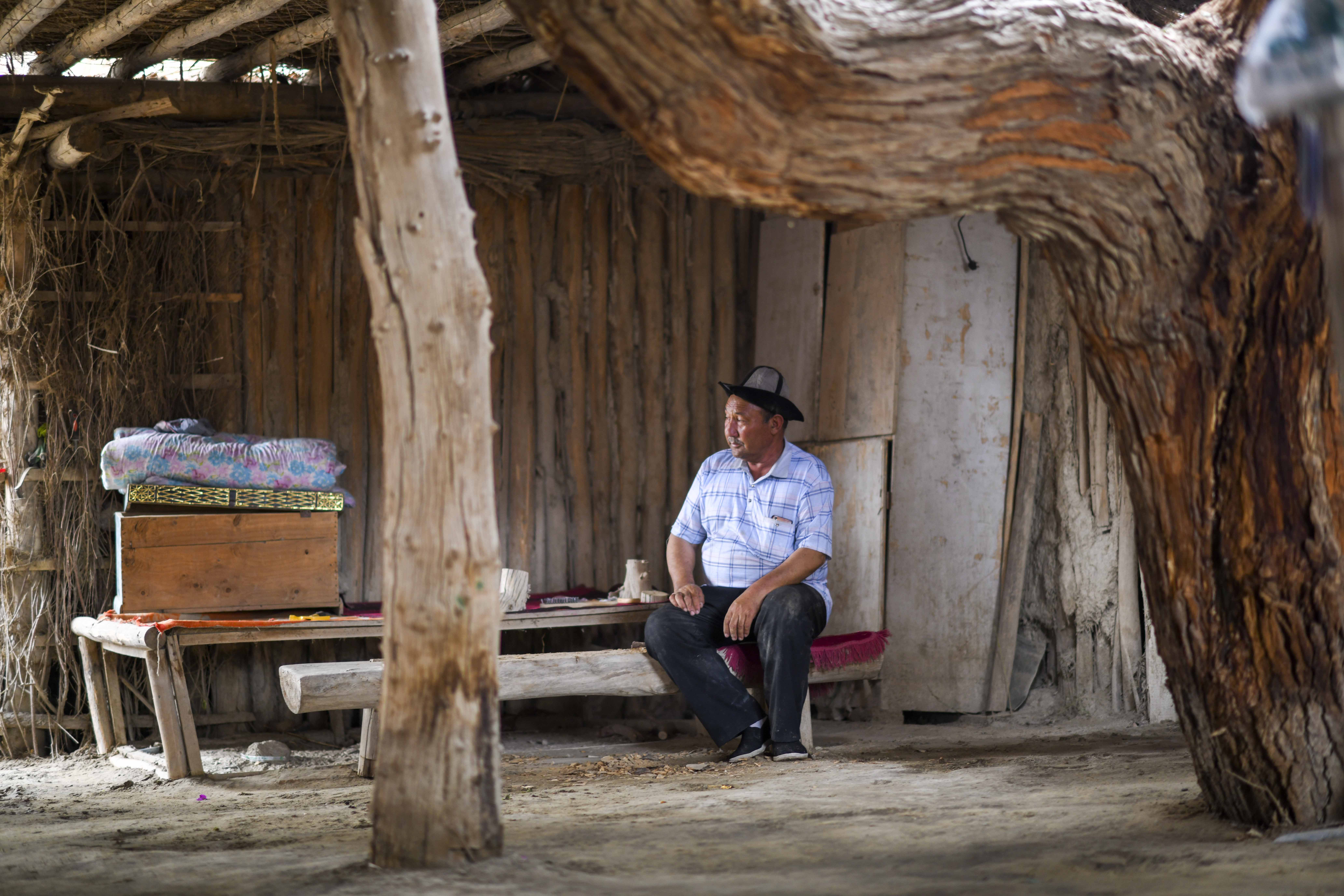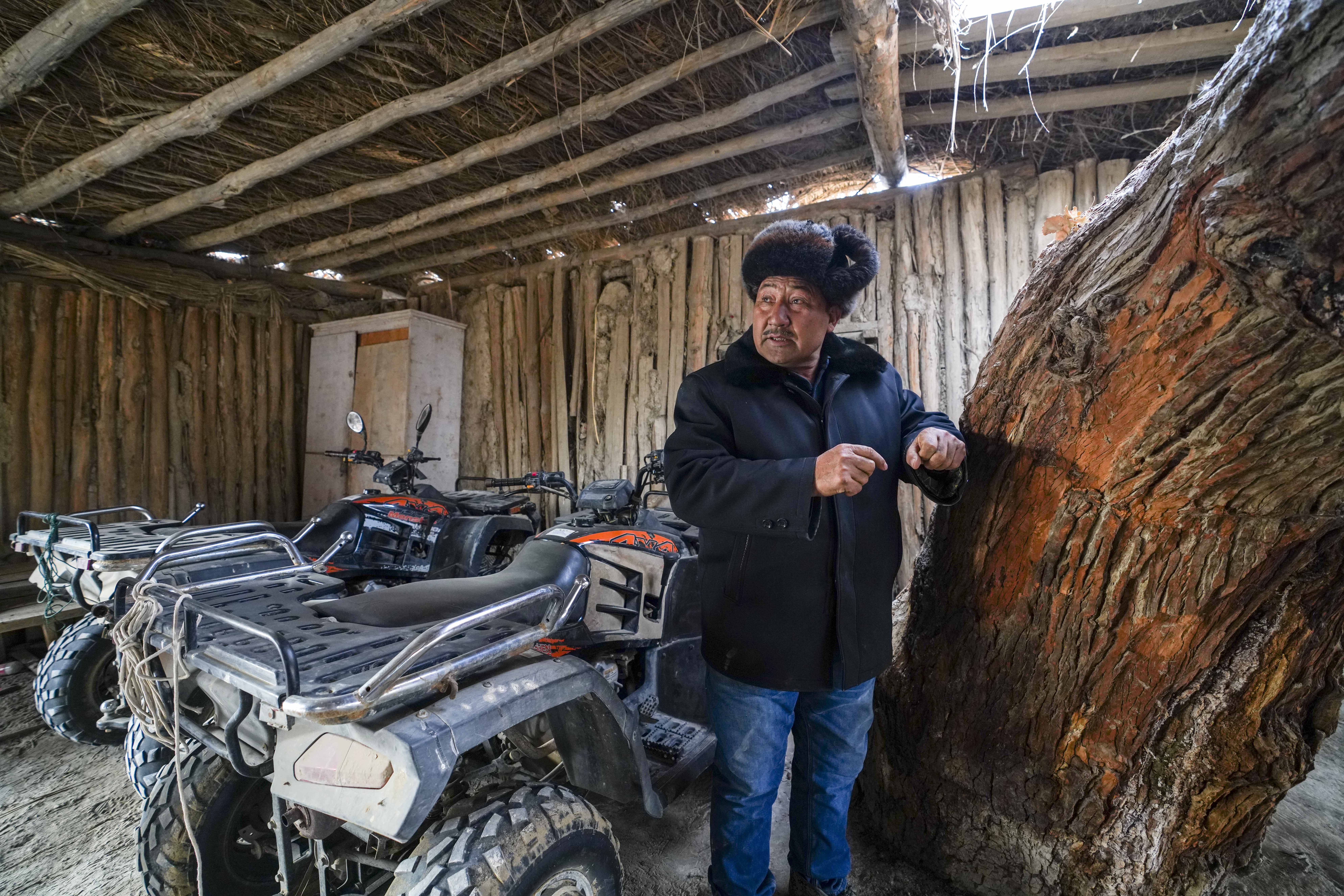 Amudun Abudu introduces a populus euphratica tree in his house in Lop Nur People Village in Yuli County, northwest China's Xinjiang Uygur Autonomous Region. (Xinhua/Zhao Ge)