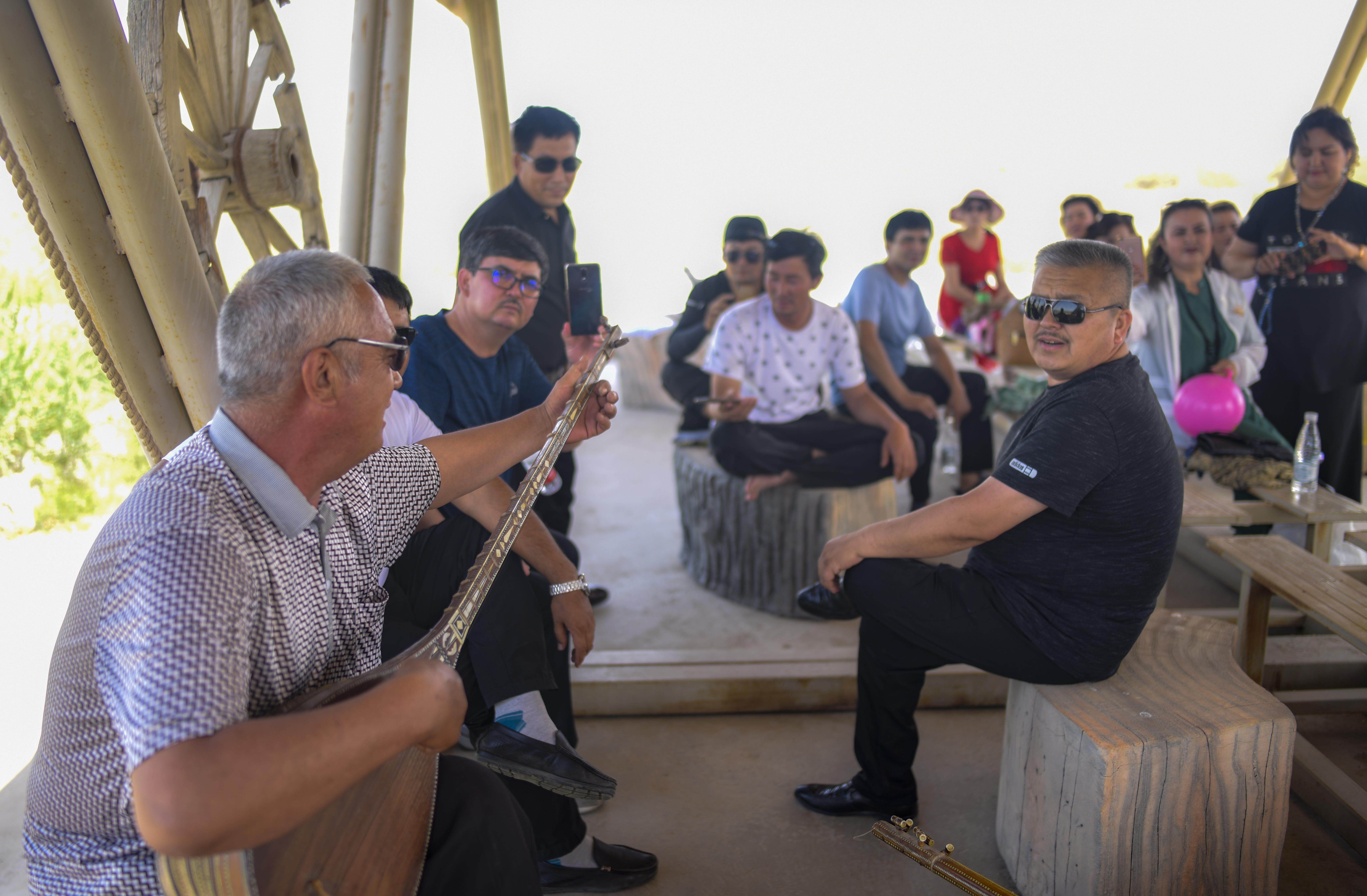 Amudun Abudu plays an instrument in Lop Nur People Village in Yuli County, northwest China's Xinjiang Uygur Autonomous Region. (Xinhua/Fei Maohua)