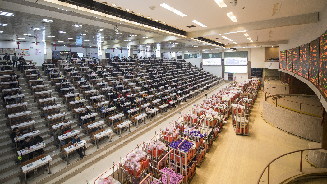 Florists bid for fresh flowers at a flower trade center in Dounan, southwest China's Yunnan Province, Feb. 12, 2019. (Xinhua/Hu Chao)