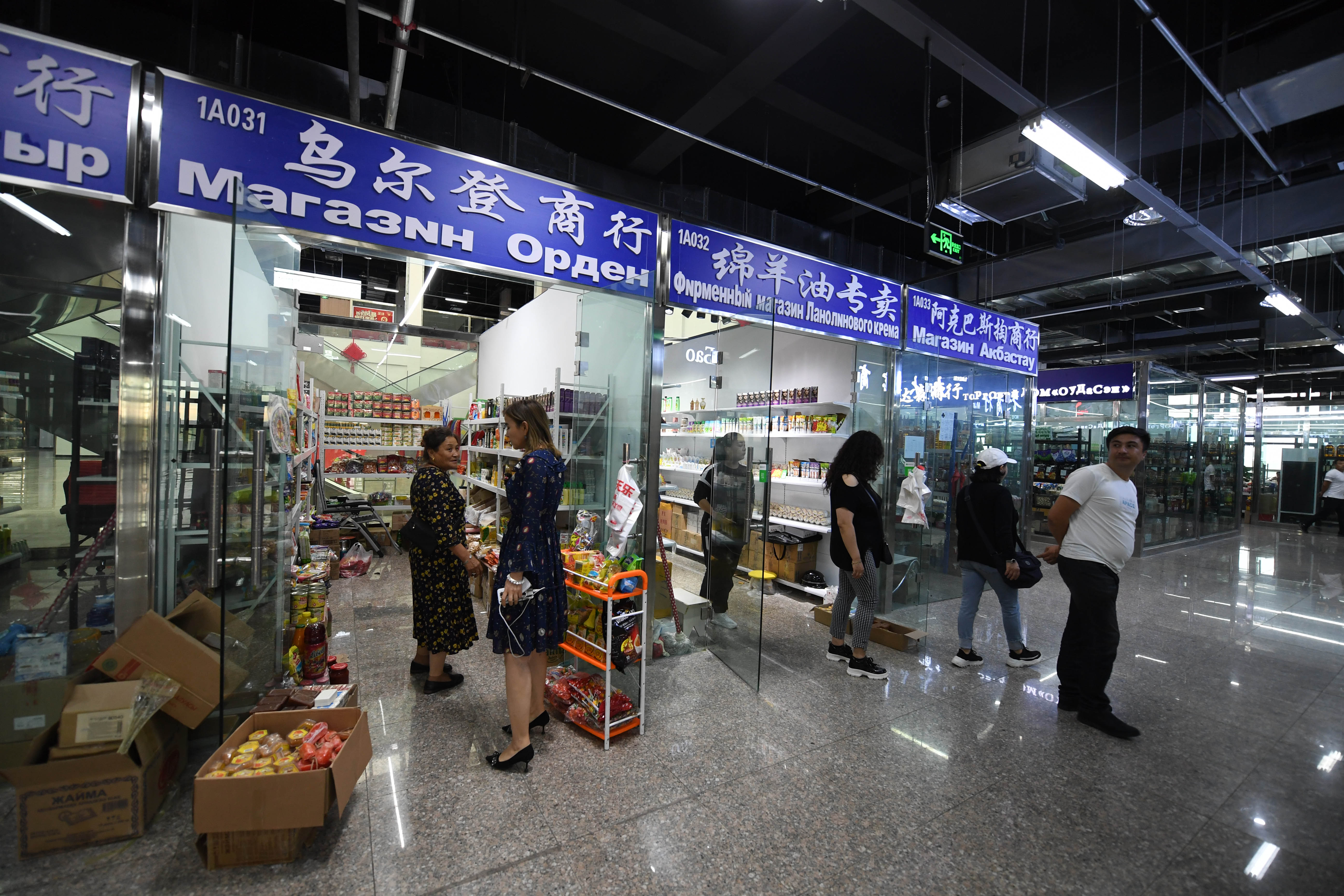 People purchase at the Bakti China-Kazakhstan border trade center in Tacheng, northwest China's Xinjiang Uygur Autonomous Region, Aug. 15, 2019. (Xinhua/Sadat)