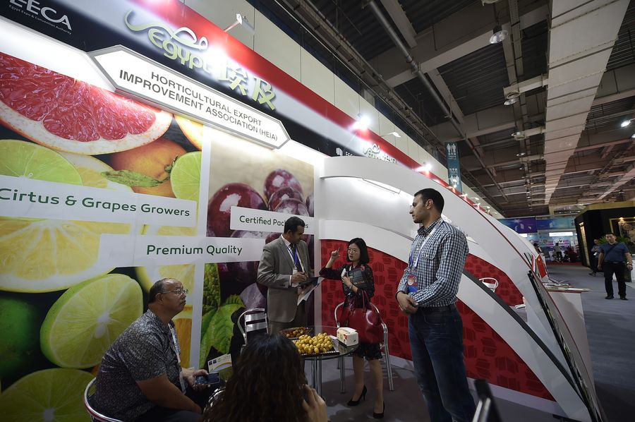 Egyptian businessmen introduce fruit to visitors during the China-Arab States Expo in Yinchuan, capital of northwest China's Ningxia Hui Autonomous Region, on Sept. 6, 2017. (Xinhua/Li Ran)