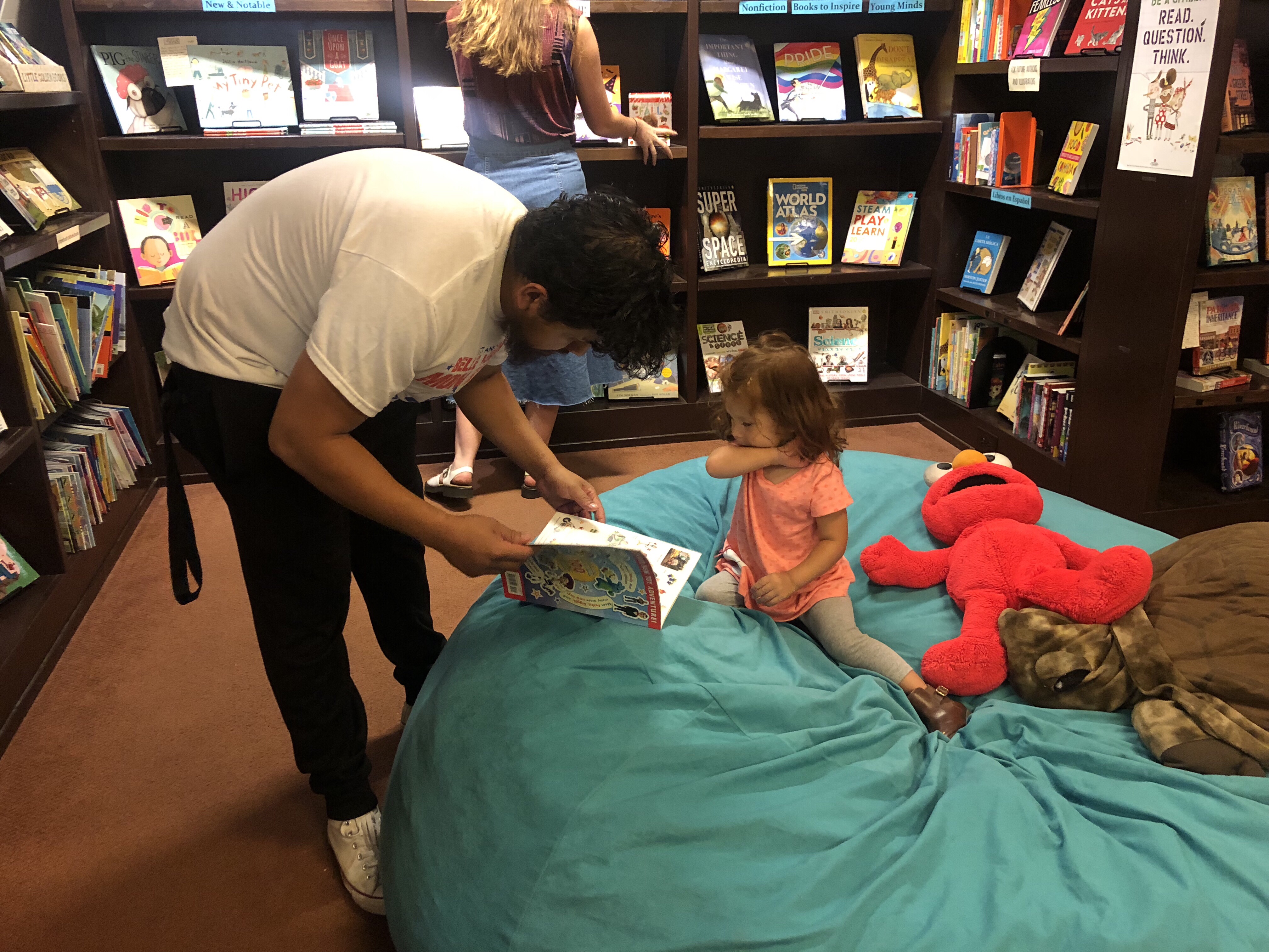 Fiocco's 15-person bookstore is located in Chapel Hill, North Carolina, with a vibrant, diverse children's book section. A blue bean bag sofa with a few toys makes it attractive for kids, who would sit comfortably with their parents to read books.