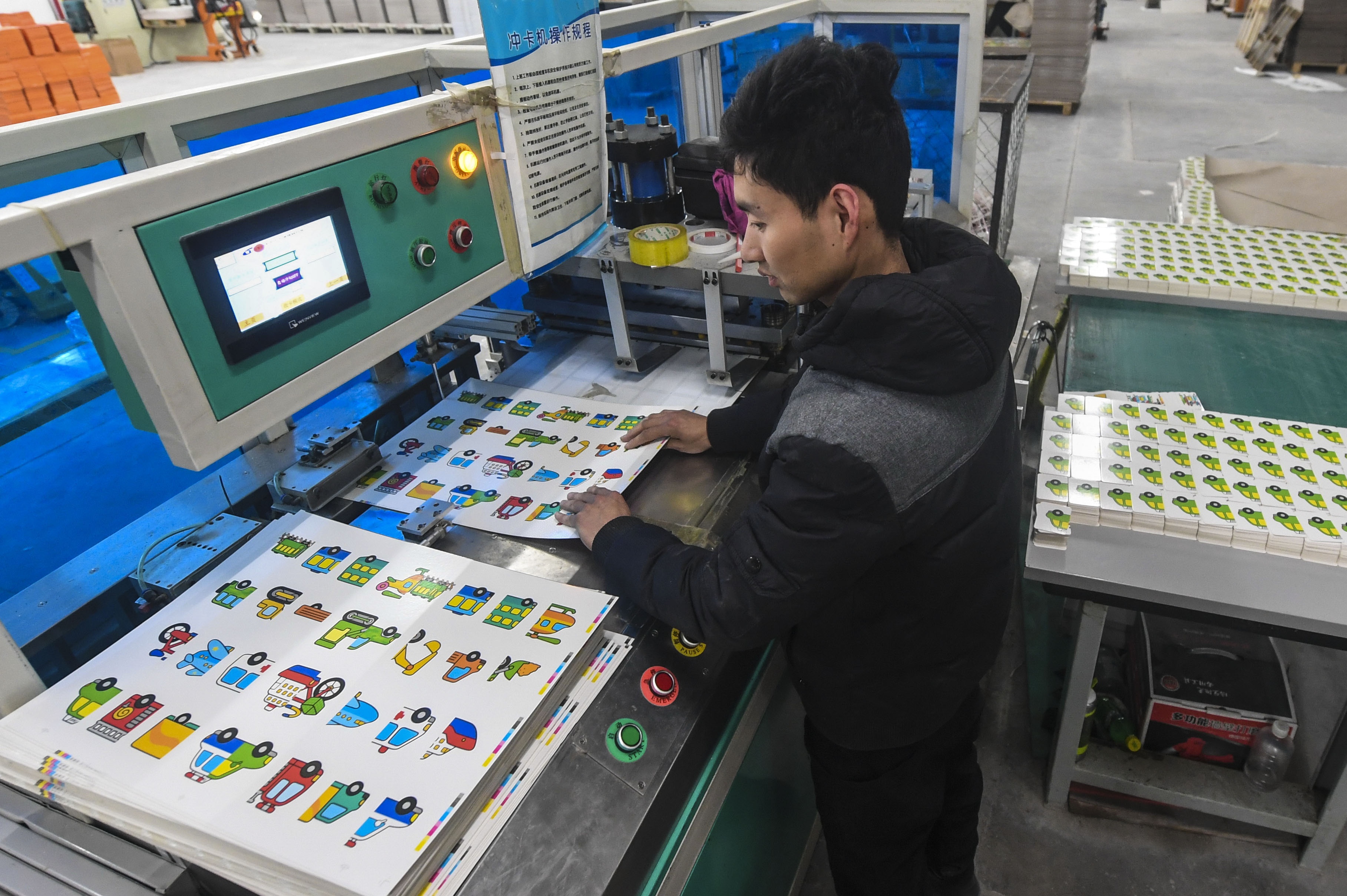 Workers operate a press to print books at a plant in Gucheng County, north China's Hebei Province, April 8, 2018. (Xinhua/Li Xiaoguo)