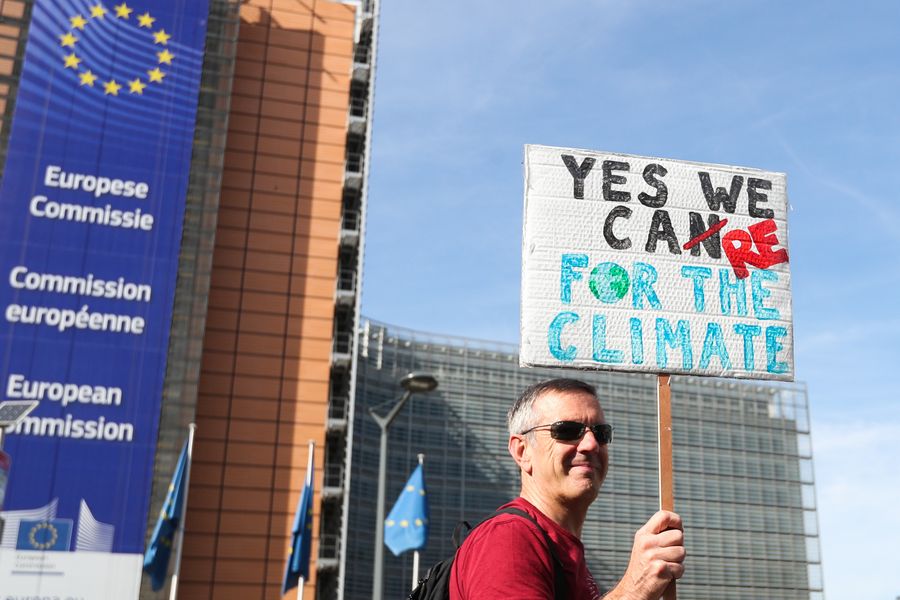 A man holds a placard during a march calling for action against climate change in Brussels, Belgium, Sept. 20, 2019. (Xinhua/Zheng Huansong)