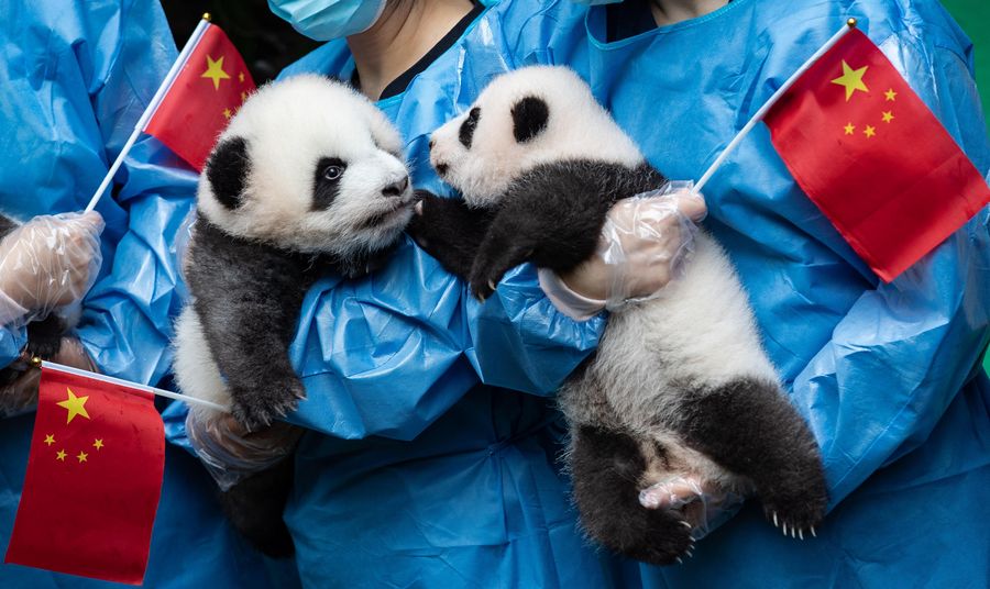 Photo taken on Sept. 24, 2019 shows giant panda cubs at Chengdu Research Base of Giant Panda Breeding in Chengdu, capital of southwest China's Sichuan Province. A total of seven giant panda cubs born in the base in 2019 met the public here Tuesday. (Xinhua/Jiang Hongjing)