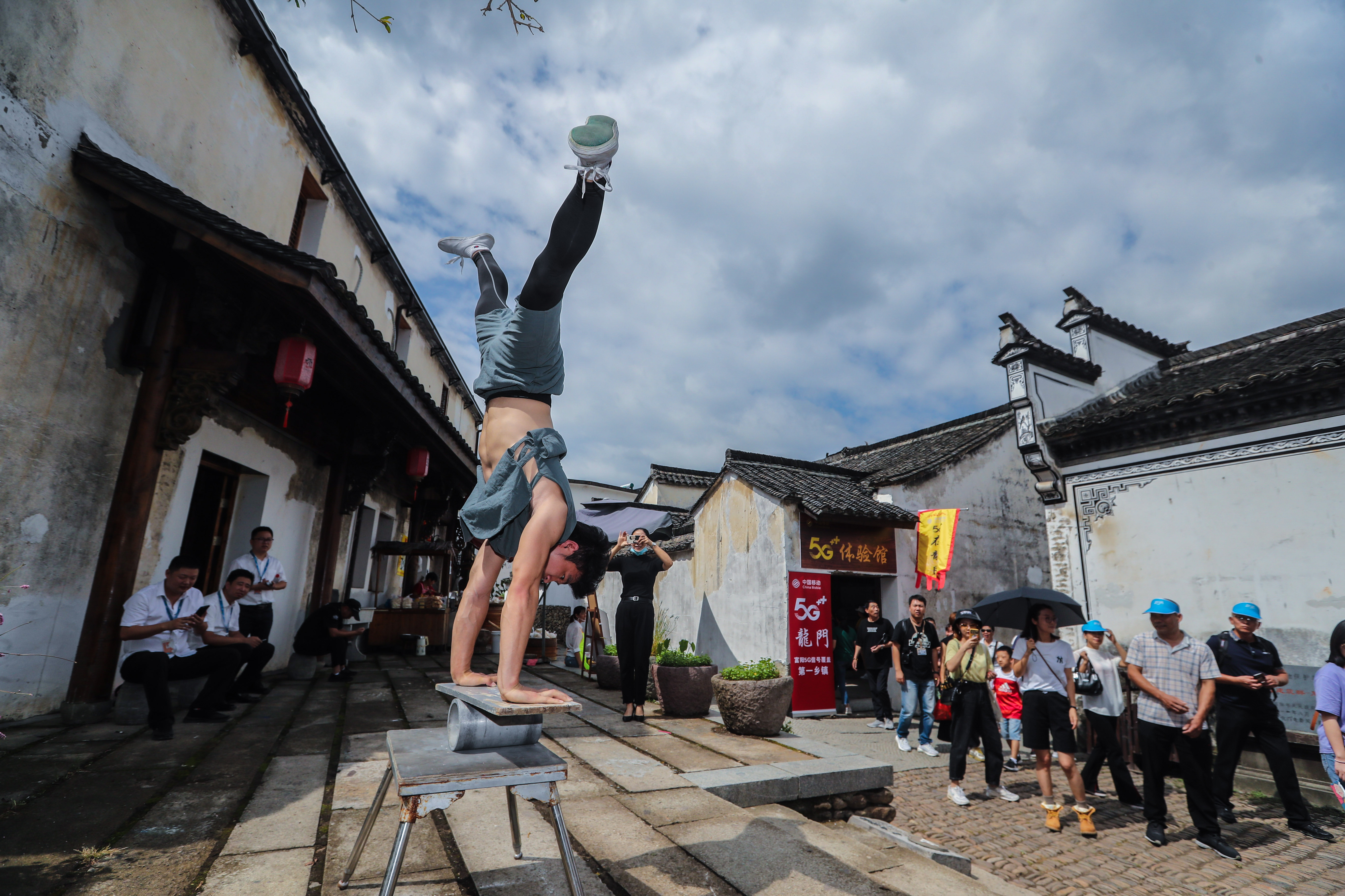 Visitors watch performance at the Longmen ancient town at Fuyang District in Hangzhou, east China's Zhejiang Province, Oct. 2, 2019, the second day of the 7-day-long National Day holiday. (Xinhua/Xu Yu)
