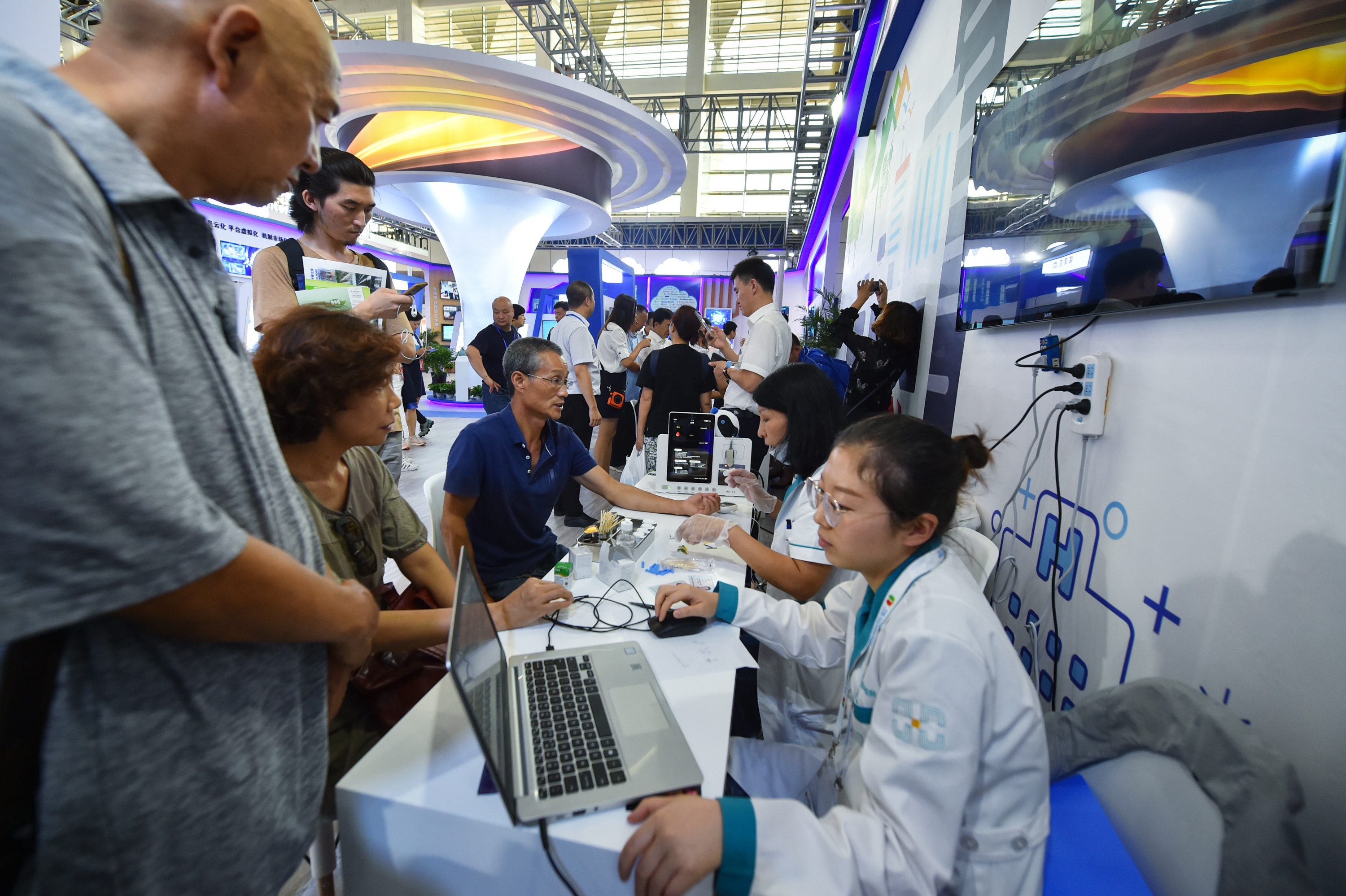 Visitors try an Internet-based healthcare service during an "Internet plus healthcare" exhibition of the ongoing fourth China-Arab States Expo in Yinchuan, northwest China's Ningxia Hui Autonomous Region, Sept. 6, 2019. (Xinhua/Li Mangmang)