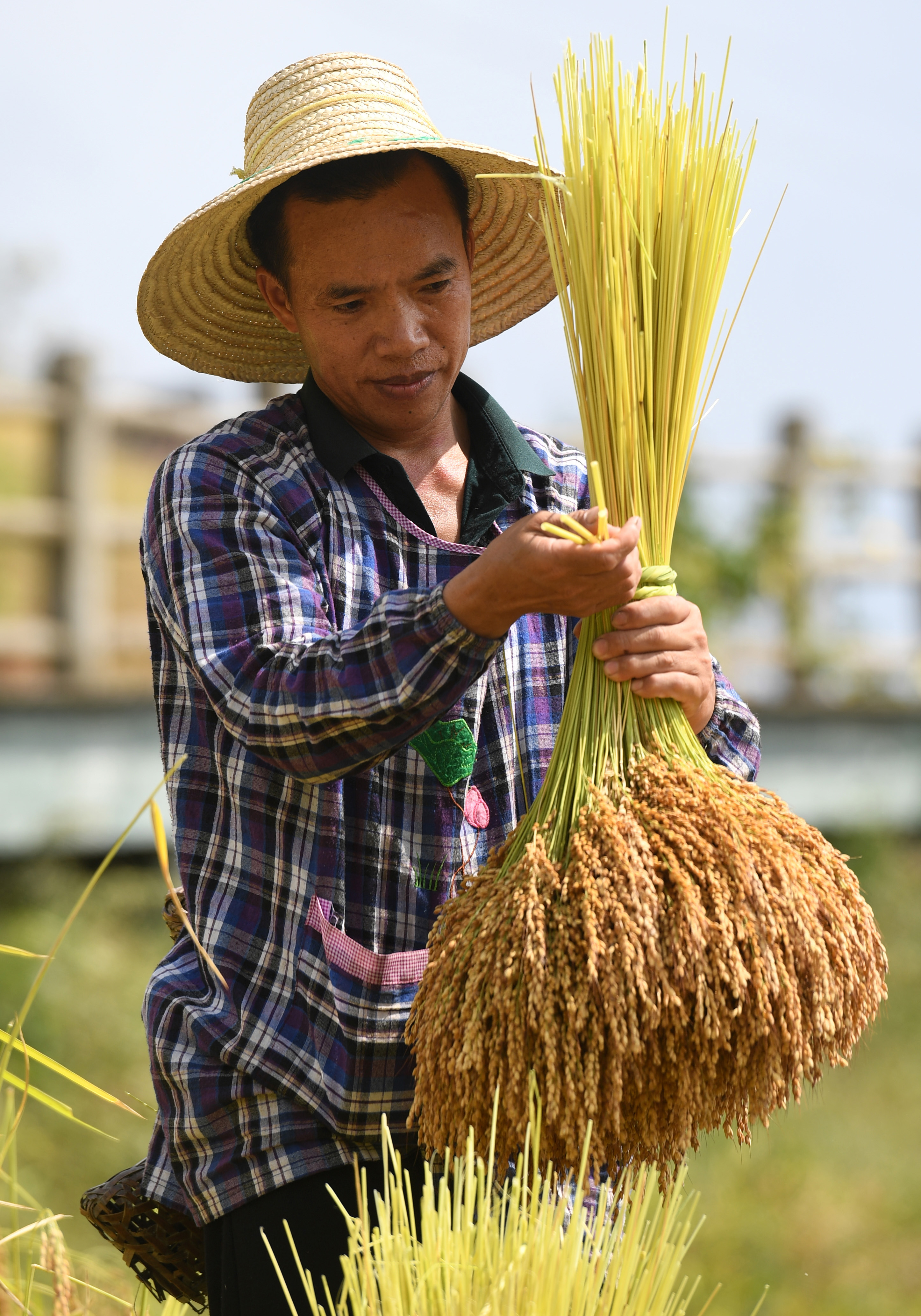 A farmer harvests rice in Longji Town in Longsheng, south China's Guangxi Zhuang Autonomous Region, Oct. 11, 2019. (Xinhua/Lu Boan)