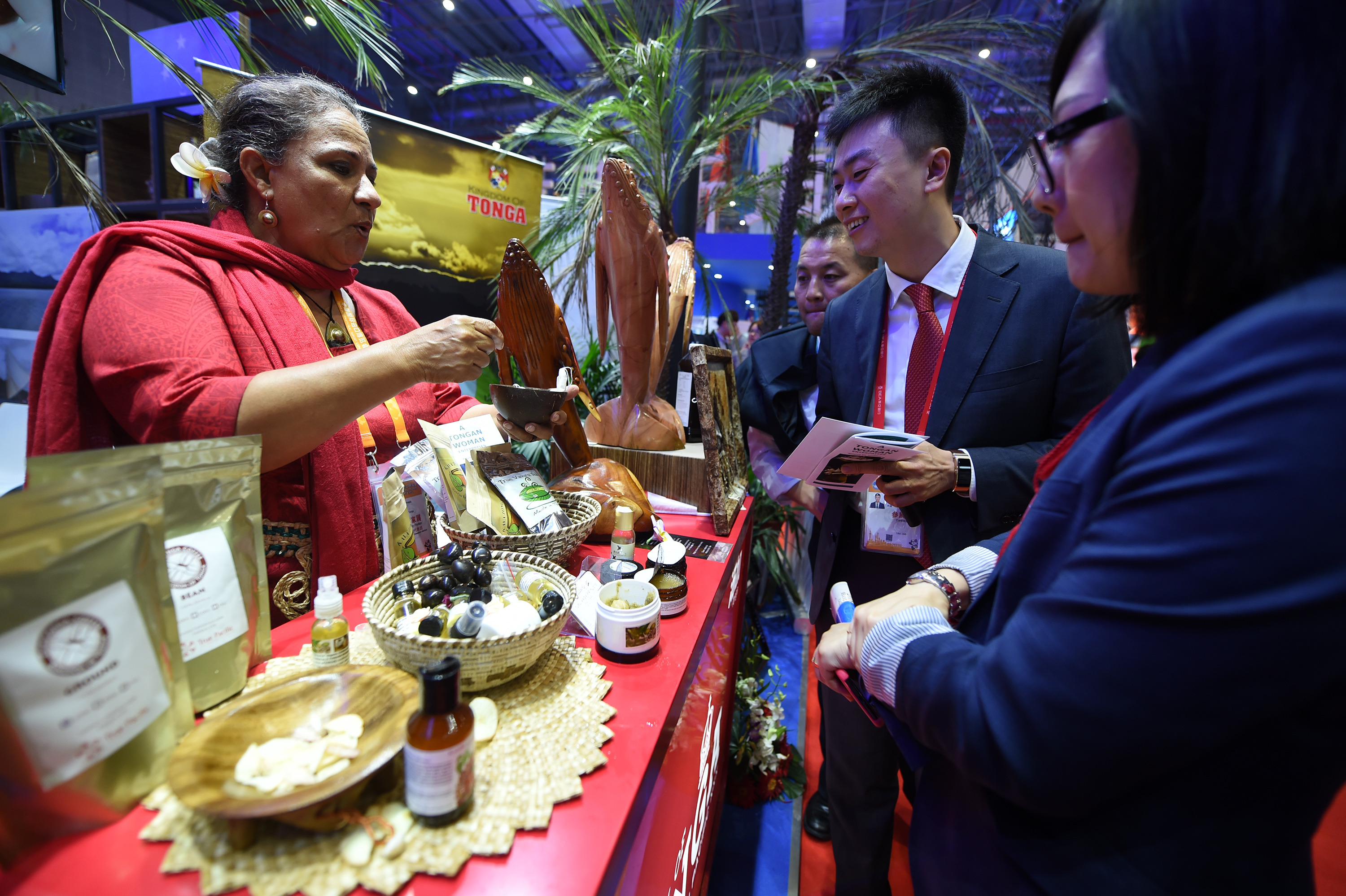 A staff member introduces food of Tonga to visitors at the first China International Import Expo (CIIE) in Shanghai, east China, Nov. 6, 2018. (Xinhua/Han Yuqing)