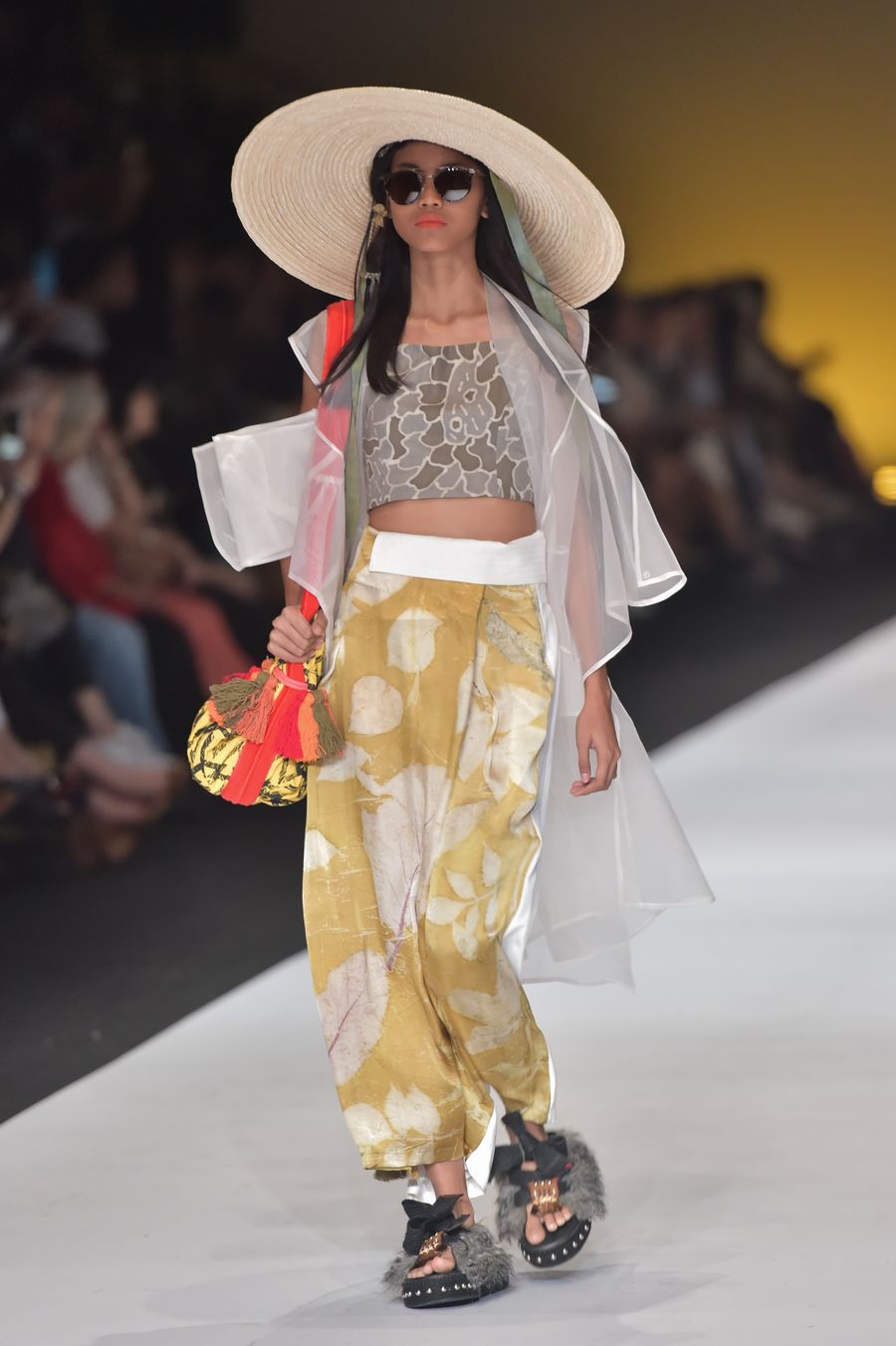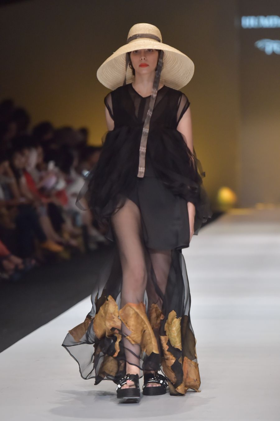 A model presents creations of Humbang Kriya and Purana during Jakarta Fashion Week 2020, in Jakarta, Indonesia, Oct. 24, 2019. (Xinhua/Veri Sanovri)