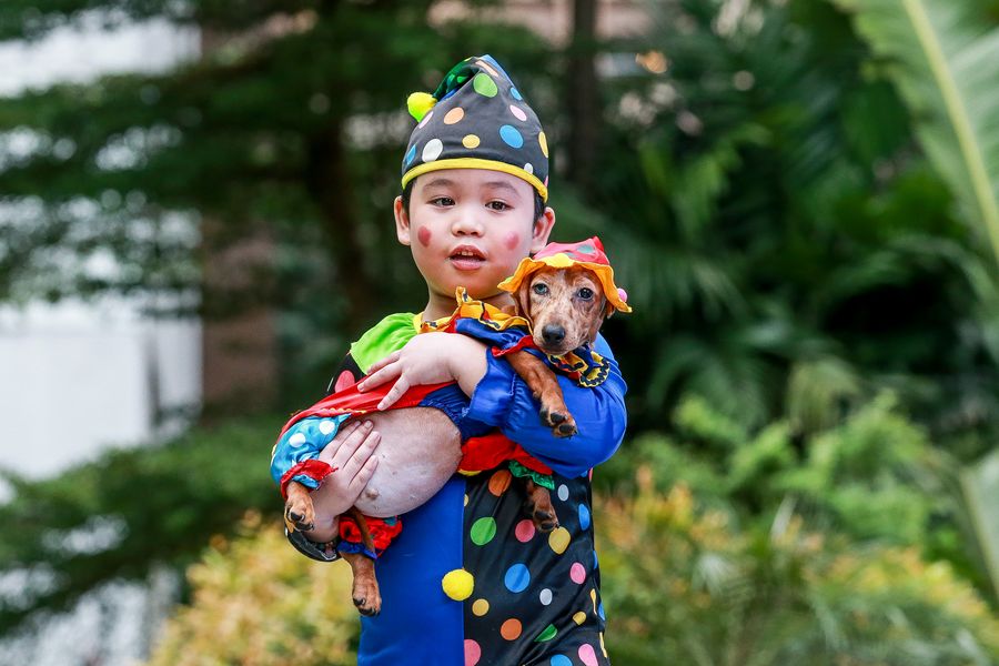 A boy and his dog dressed in Halloween costumes take part in the "Petrified" Halloween celebration in Quezon City, the Philippines, Oct. 27, 2019. (Xinhua/Rouelle Umali)