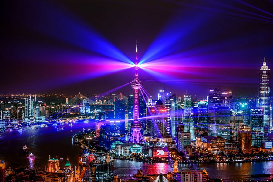 Aerial photo taken on Sept. 18, 2019 shows the night view of the Huangpu River in Shanghai, east China.(Xinhua/Ren Long)