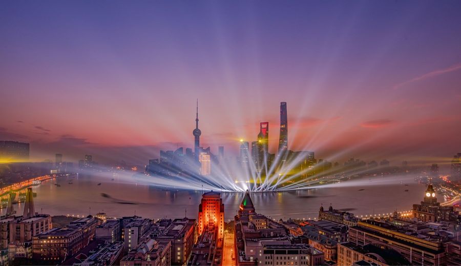 A light show is seen along the Huangpu River in Shanghai, east China, Sept. 18, 2019. (Xinhua/Ren Long)