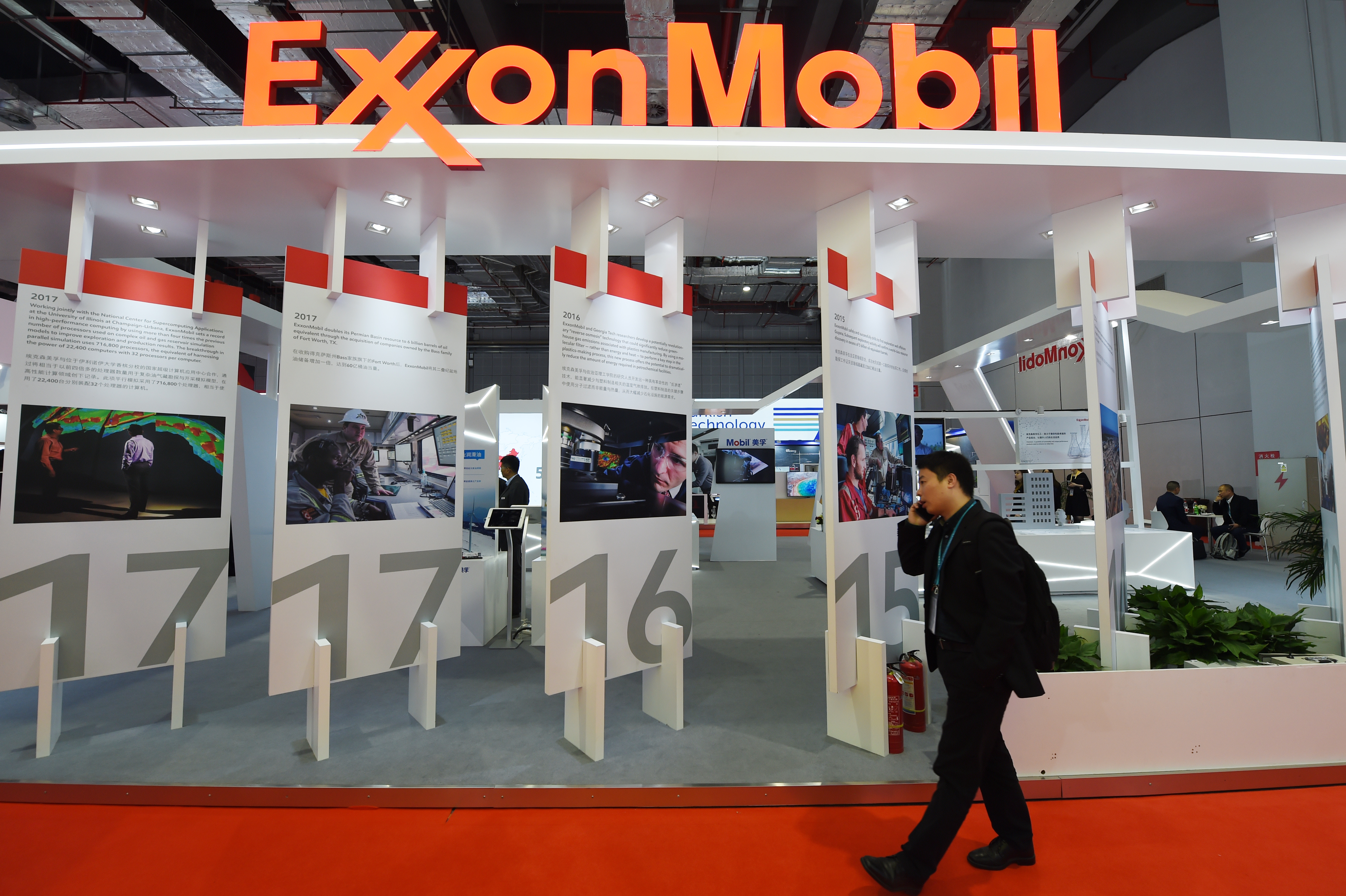 A visitor walks past the booth of Exxon Mobil Corp. during the second China International Import Expo (CIIE) in Shanghai, east China, on Nov. 7, 2019. (Xinhua/Fan Peishen)