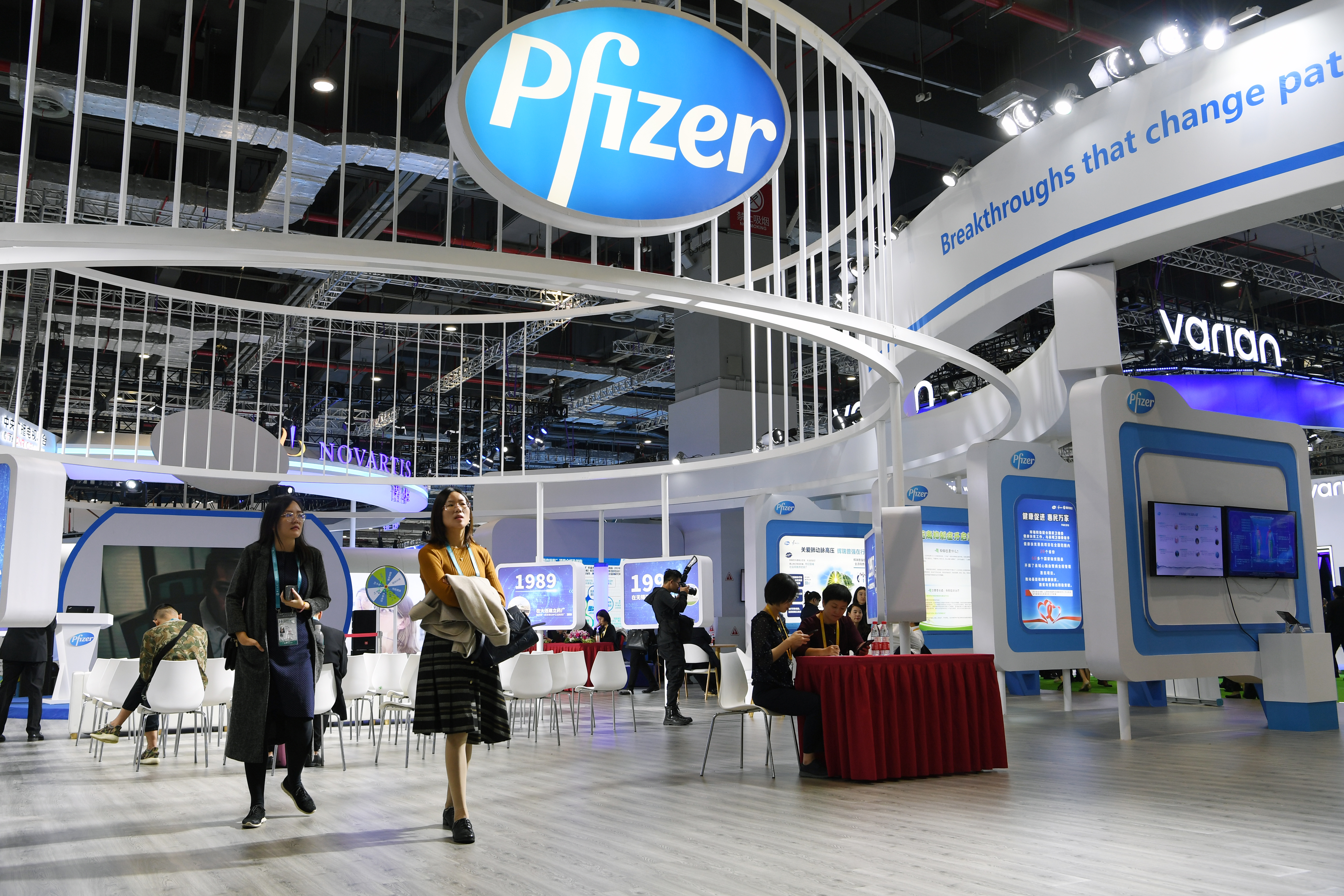 Photo taken on Nov. 7, 2019 shows the booth of Pfizer Inc. during the second China International Import Expo (CIIE) in Shanghai, east China. (Xinhua/Fan Peishen)