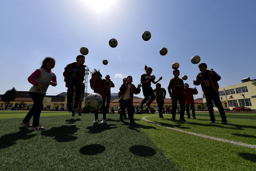 Students play football at Huangyadong school in Licheng County of Changzhi City in north China's Shanxi Province, on April 16, 2019. (Xinhua/Zhan Yan)