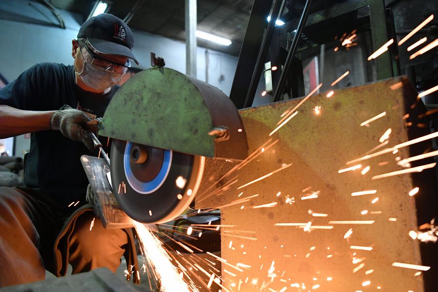 A craftsman polishes Kinmen steel knife at a workshop in southeast China's Kinmen on Sept. 18, 2019. The steel knife forged with raw materials of discarded shells is a famous product of Kinmen. (Xinhua/Chen Bin)