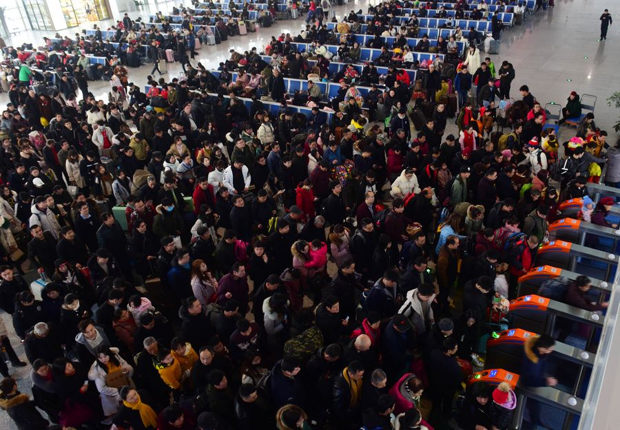 Passengers queue to enter the Wuxi Station in Wuxi, east China's Jiangsu Province, Feb. 20, 2019. Hundreds of millions of Chinese travel back to their hometowns to celebrate the Spring Festival. The annual travel rush around the festival, known as "chunyun," often puts the country's transportation system to the test. (Xinhua/Hai Yueliang)