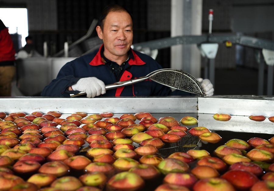 A staff member washes apples in an automatic equipment at an agricultural science and technology park in Aksu, northwest China's Xinjiang Uygur Autonomous Region, Nov. 28, 2019. (Xinhua/Song Yanhua)