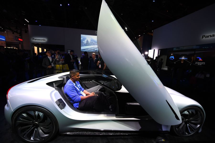 A staff member sits in a car during the 2020 Consumer Electronics Show (CES) in Las Vegas, the United States, Jan. 7, 2020. The world's premier tech show was wrapped up here on Friday. The four-day show drew more than 4,500 exhibitors from over 160 countries. (Xinhua/Wu Xiaoling)