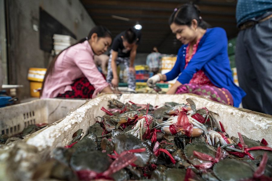 Workers sort crabs imported from Myanmar at a market in Ruili City, southwest China's Yunnan Province, Nov. 5, 2019. (Xinhua/Jiang Wenyao)