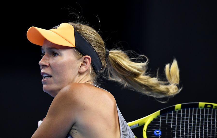 Caroline Wozniacki of Denmark hits a return during the women's singles second round match against Dayana Yastremska of Ukraine at the 2020 Australian Open tennis tournament in Melbourne, Australia, Jan. 22, 2020. (Xinhua/Wang Jingqiang)
