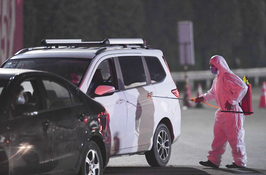 A staff member disinfects a car at an expressway toll station in Wanzhou, southwest China's Chongqing Municipality, Jan. 30, 2020. (Xinhua/Wang Quanchao)