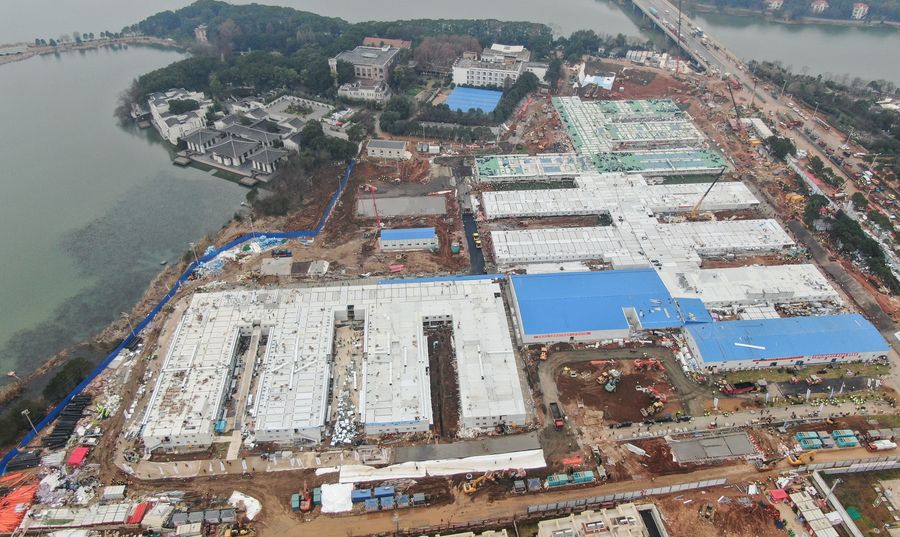 Aerial photo taken on Feb. 2, 2020 shows the Huoshenshan Hospital in Wuhan, the epicenter of the virus outbreak in central China's Hubei Province. (Xinhua/Cheng Min)