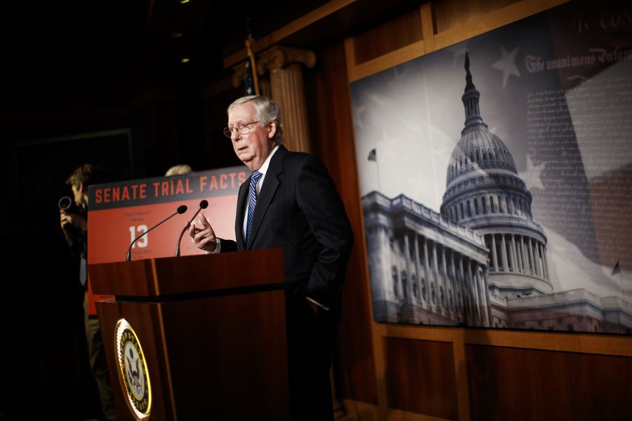 U.S. Senate Majority Leader Mitch McConnell speaks during a press conference following a vote in the U.S. Senate to acquit President Donald Trump on impeachment on Capitol Hill in Washington D.C., the United States, Feb. 5, 2020. (Photo by Ting Shen/Xinhua)