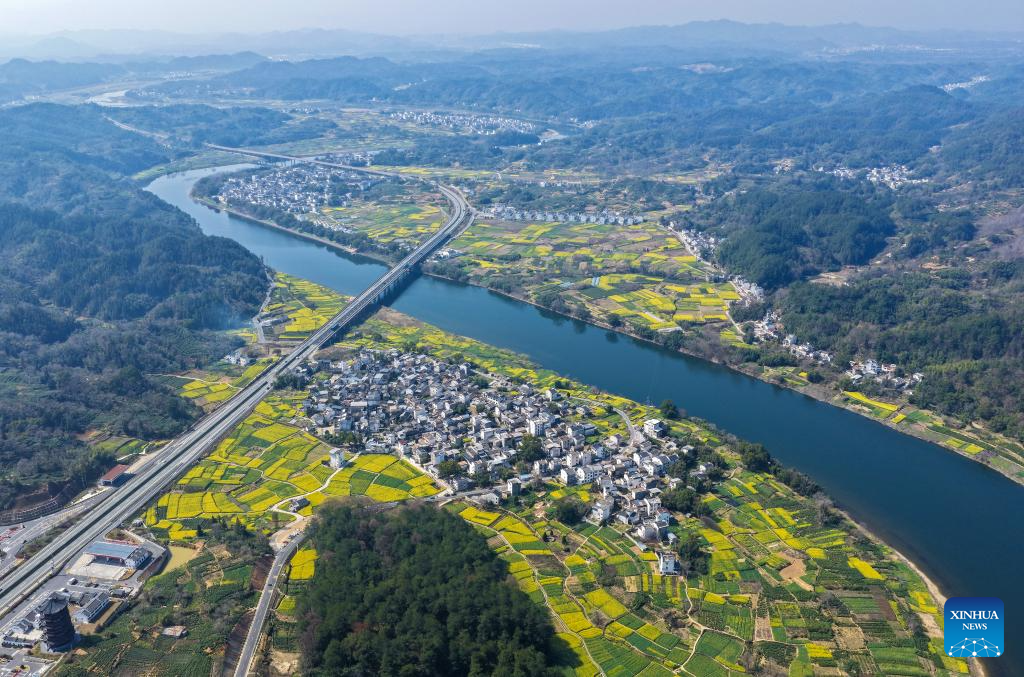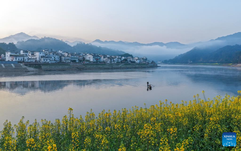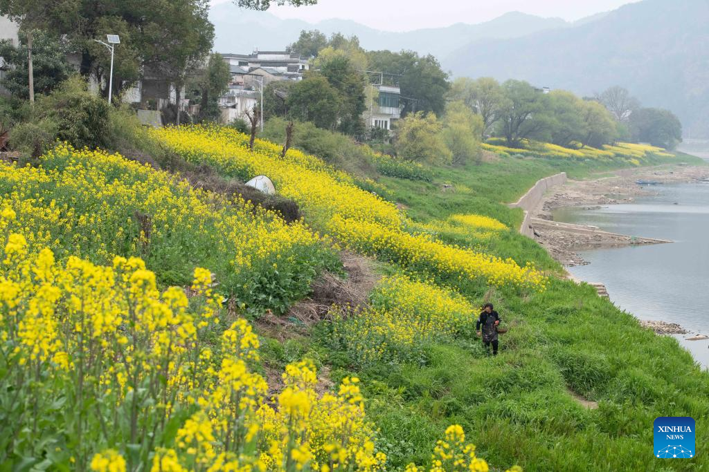 This photo taken on March 15, 2026 shows the scenery along the Xin'an River in Kengkou Township of Shexian County in Huangshan, east China's Anhui Province. As spring unfolds, rapeseed flowers along the Xin'an River, a bio-diverse waterway which flows from Anhui to Zhejiang, have entered blooming season. (Xinhua/Zhang Duan)