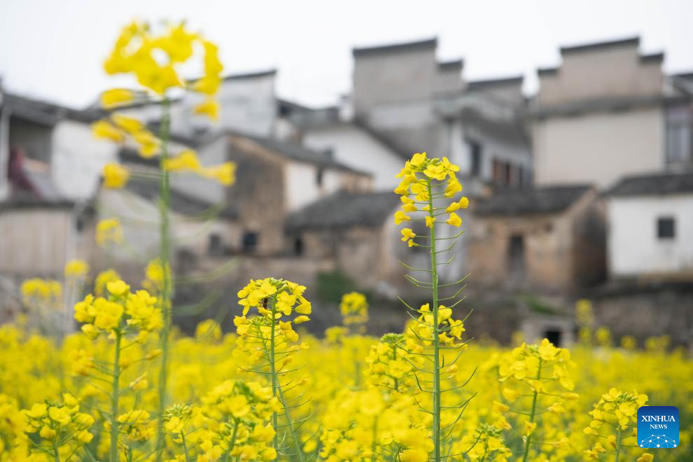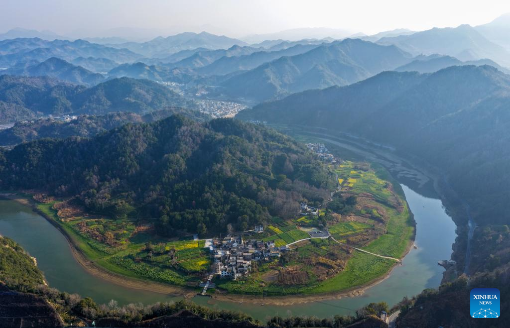 This photo taken on March 16, 2026 shows the scenery in a village near the Xin'an River in Shexian County of Huangshan, east China's Anhui Province. As spring unfolds, rapeseed flowers along the Xin'an River, a bio-diverse waterway which flows from Anhui to Zhejiang, have entered blooming season. (Xinhua/Zhang Duan)