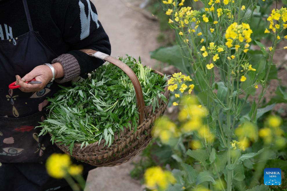 A villager carries edible wild plants near the Xin'an River in Kengkou Township of Shexian County in Huangshan, east China's Anhui Province, March 15, 2026. As spring unfolds, rapeseed flowers along the Xin'an River, a bio-diverse waterway which flows from Anhui to Zhejiang, have entered blooming season. (Xinhua/Zhang Duan)