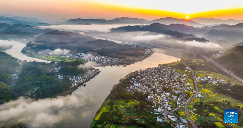 This photo taken on March 11, 2026 shows the morning scenery along the Xin'an River in Shendu Town of Shexian County in Huangshan, east China's Anhui Province. As spring unfolds, rapeseed flowers along the Xin'an River, a bio-diverse waterway which flows from Anhui to Zhejiang, have entered blooming season. (Photo by Shi Yalei/Xinhua)