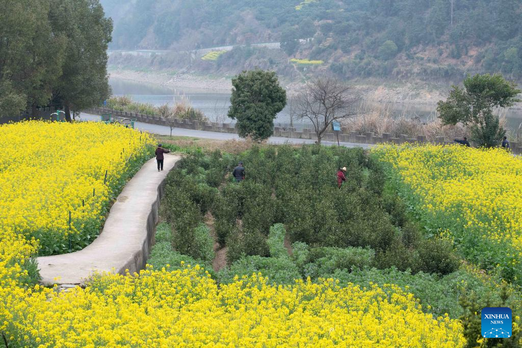 A villager works in a field in a village near the Xin'an River in Shexian County of Huangshan, east China's Anhui Province, March 16, 2026. As spring unfolds, rapeseed flowers along the Xin'an River, a bio-diverse waterway which flows from Anhui to Zhejiang, have entered blooming season. (Xinhua/Zhang Duan)