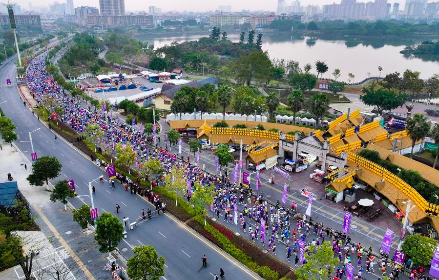KUNMING, March 18 (Xinhua) -- As the starting gun fired at the Luoping county sports center in Qujing, southwest China's Yunnan Province, for the 2026 Qujing Luoping Grand Blossom Marathon on March 15, over 20 international participants from eight countries and regions, including Thailand, Slovenia, Singapore and Bangladesh, alongside runners from across China, took to the flower-bordered course.